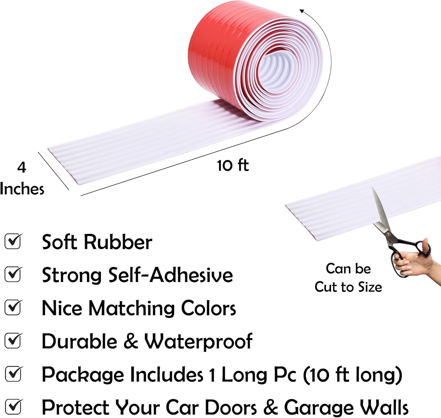 RUBBER BOND Garage Wall Protectors - 4in x 10ft Strong Self-Adhesive Rubber Bumper Protectors for Garage Walls - Heavy Duty, Waterproof and Anti-Scratch Garage Wall Protector for Car Doors (White)