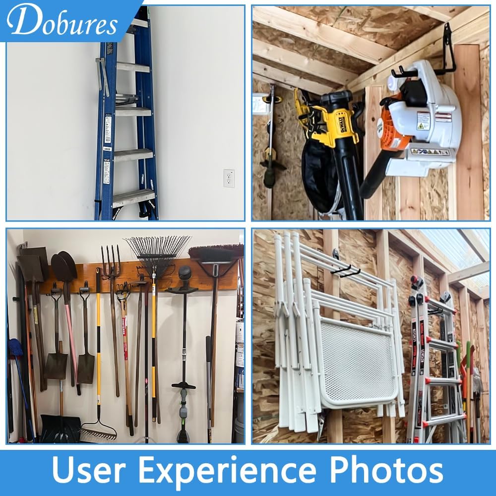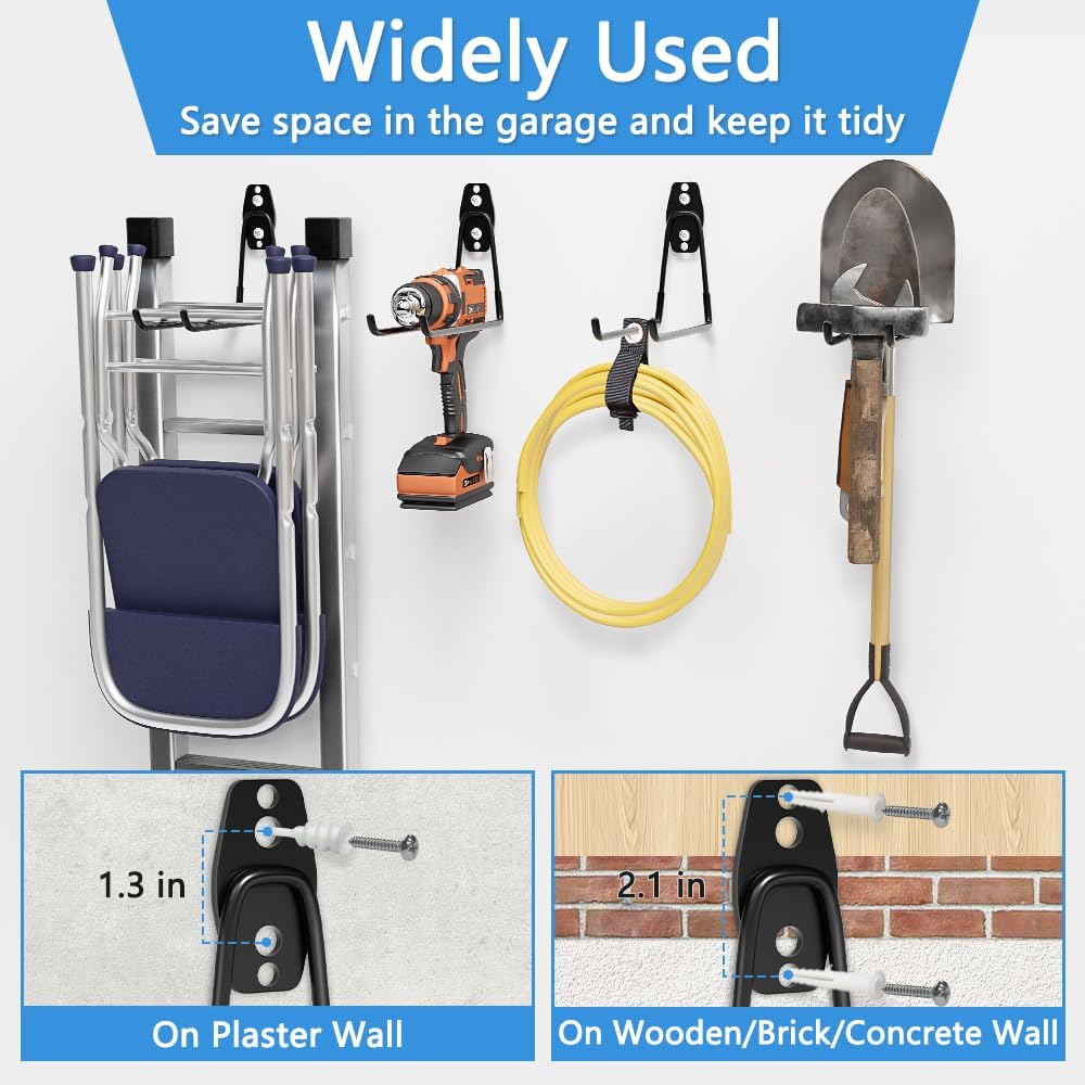 - Widely Applicable: These hooks save space and maximize your space in home and apartment, garage, basement, tool shop. Versatile and Reusable, for holding ladders, hoses, garden tools, power tools, bikes, shovel, broom, scooter, weed eater, or bulk items.