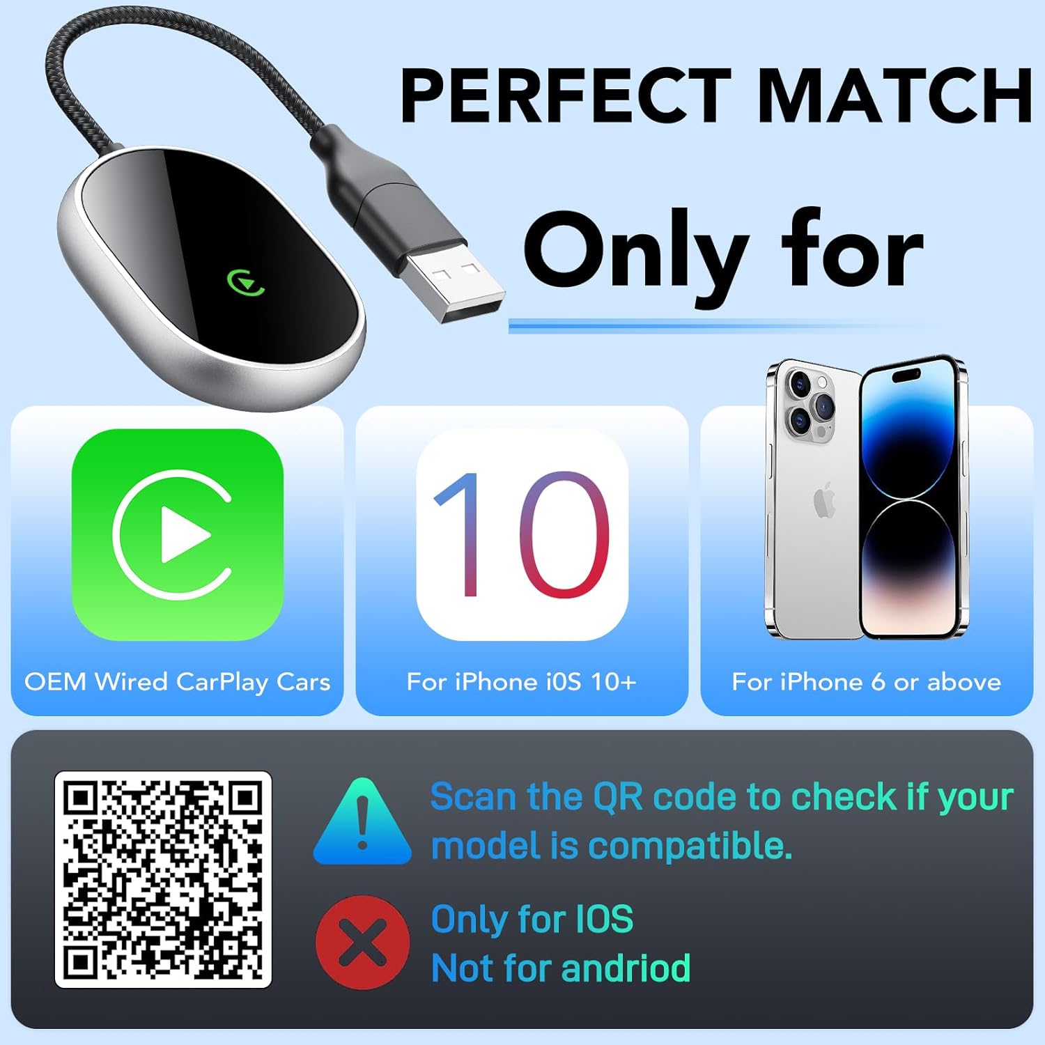 - 【Stylish and Durable Design】: The stylish, minimalist look of car play adapter enhances your car's interior. Its compact, space-saving design features a flexible nylon braided cable that can withstand 10,000+ bends and insertions. The high-density aluminum alloy shell effectively dissipates 90% of heat and protects the built-in circuits, providing peace of mind for long-lasting, reliable use.