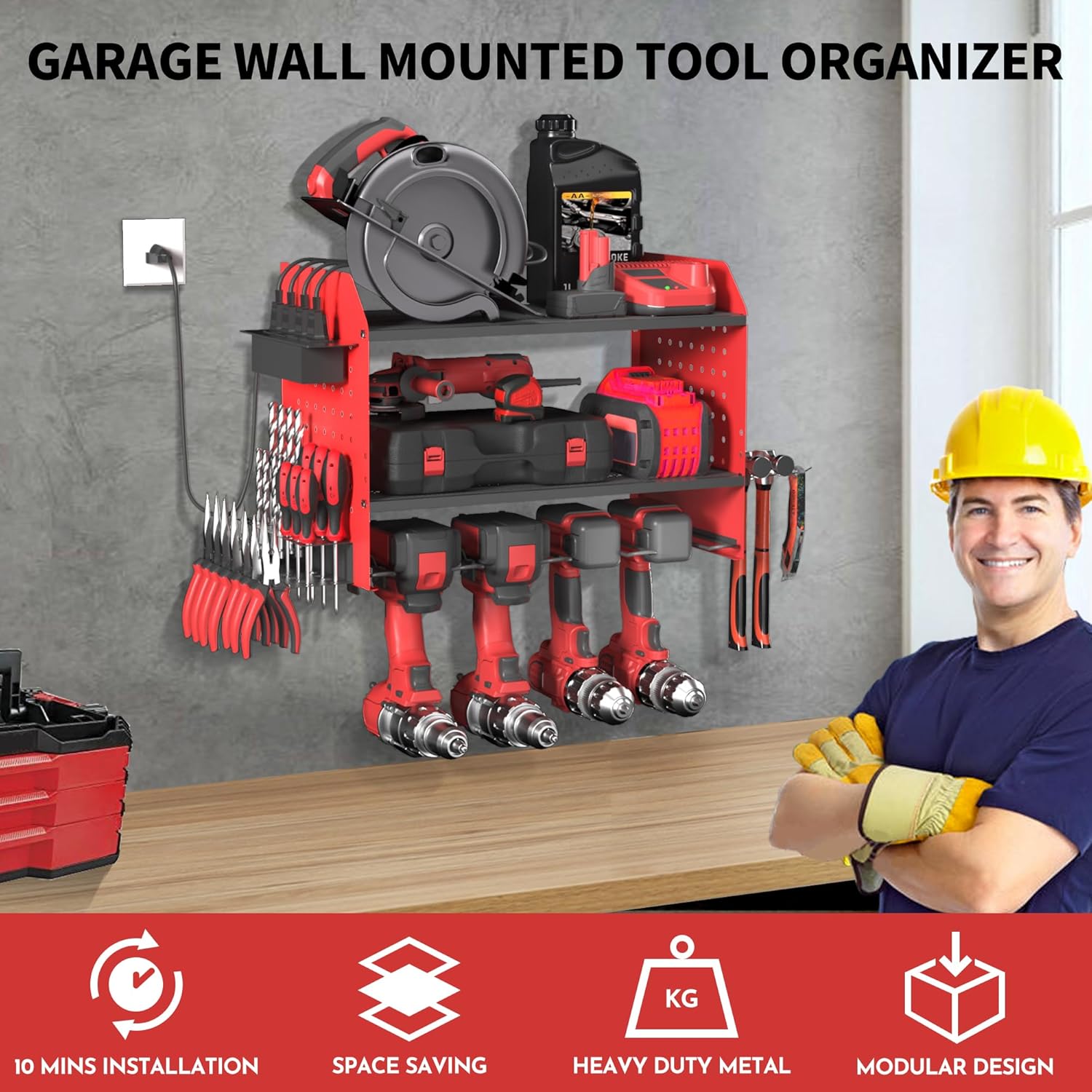 - Side Mounted 4-Outlet Charging Station:This wall-mounted power tool organizer charge up to four batteries at once without hunting for outlets. The built-in power strip works perfectly for cordless drills, impact drivers, and other battery-powered tools, keeping your workflow smooth and cords tangle-free