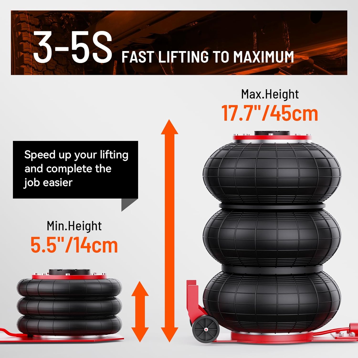 - Upgraded Stability Design: The air jack features six reinforced steel pipes, optimized for height and structure. This design ensures exceptional stability when lifting heavy vehicles.