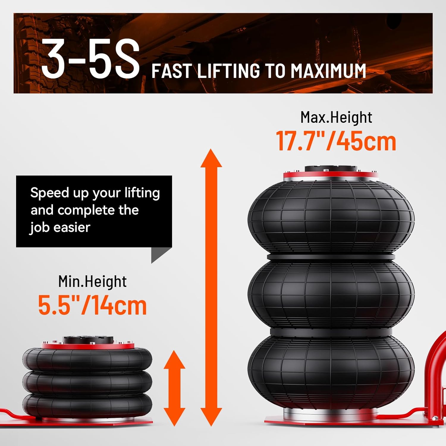 - 6600 lbs Load Capacity: This powerful 3 Ton (6600 lbs) air bag jack effortlessly handles a wide range of vehicles, from family cars and pickups to SUVs. Perfect for both home and commercial use, it’s your go-to tool for heavy-duty lifting.