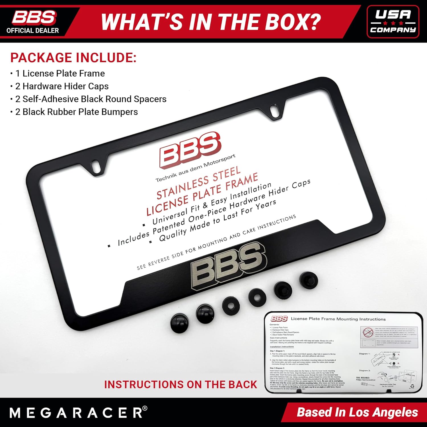 - CONTENTS: 1x BBS license plate frame, 2x hardware hider caps, 2x self-adhesive black round spacers, 2x black rubber plate bumpers (screws are not included).