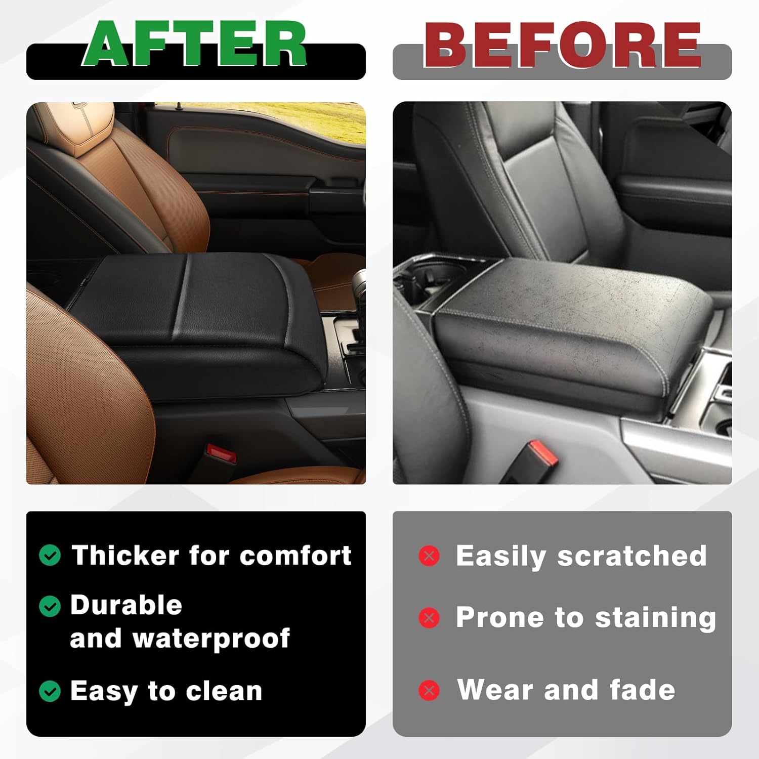Muslogy Center Console Armrest Cover Compatible with Ford F150 2021-2024 2025 Comfort Armrest Pad Arm Rest Cushion Vegan Leather Protector 1-Inch Extra Thick(Bucket Seat ONLY)
