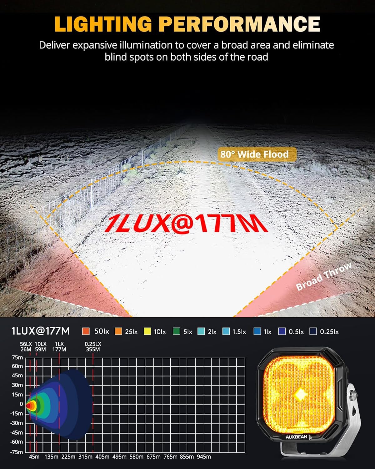 - 【EXPANSIVE FLOOD BEAM FOR TOTAL COVERAGE】Featuring a wide 120° beam angle, auxbeam flood lights provide exceptional peripheral vision and even, broad illumination. The anti-glare design ensures clear visibility without harsh diffusion, enhancing safety and confidence on any terrain. Whether you're navigating tight trails or open roads, these lights deliver the perfect balance of brightness and coverage, lighting up your surroundings for a safer, more controlled drive