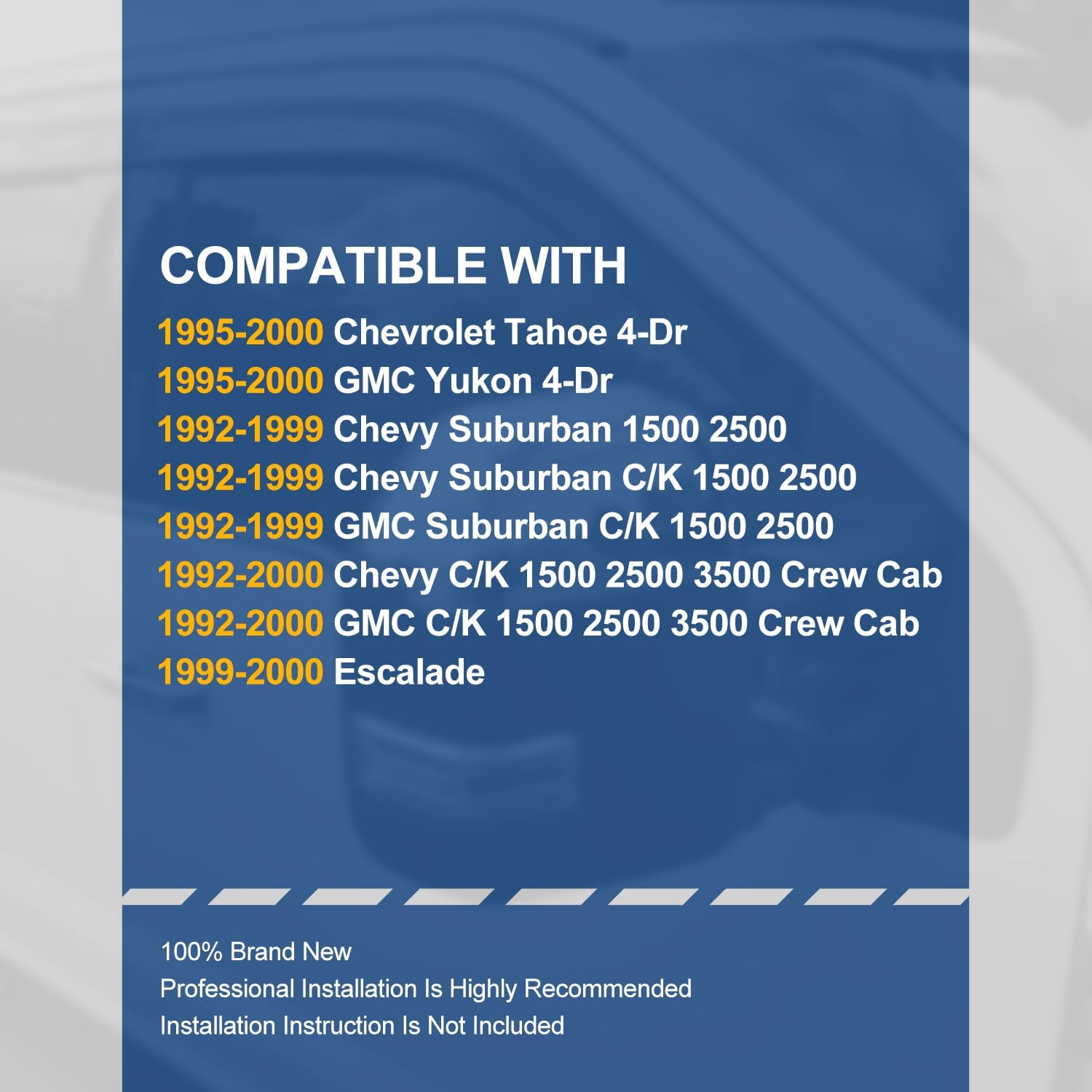 - Vehicle Compatibility - Window Visors Compatible with 1995-2000 Chevrolet Tahoe 4-Dr, 1995-2000 GMC Yukon 4-Dr, 1992-1999 Chevy Suburban 1500 2500, 1992-1999 Chevy Suburban C/K 1500 2500, 1992-1999 GMC Suburban C/K 1500 2500, 1992-2000 Chevy C/K 1500 2500 3500 Crew Cab, 1992-2000 GMC C/K 1500 2500 3500 Crew Cab, 1999-2000 Escalade