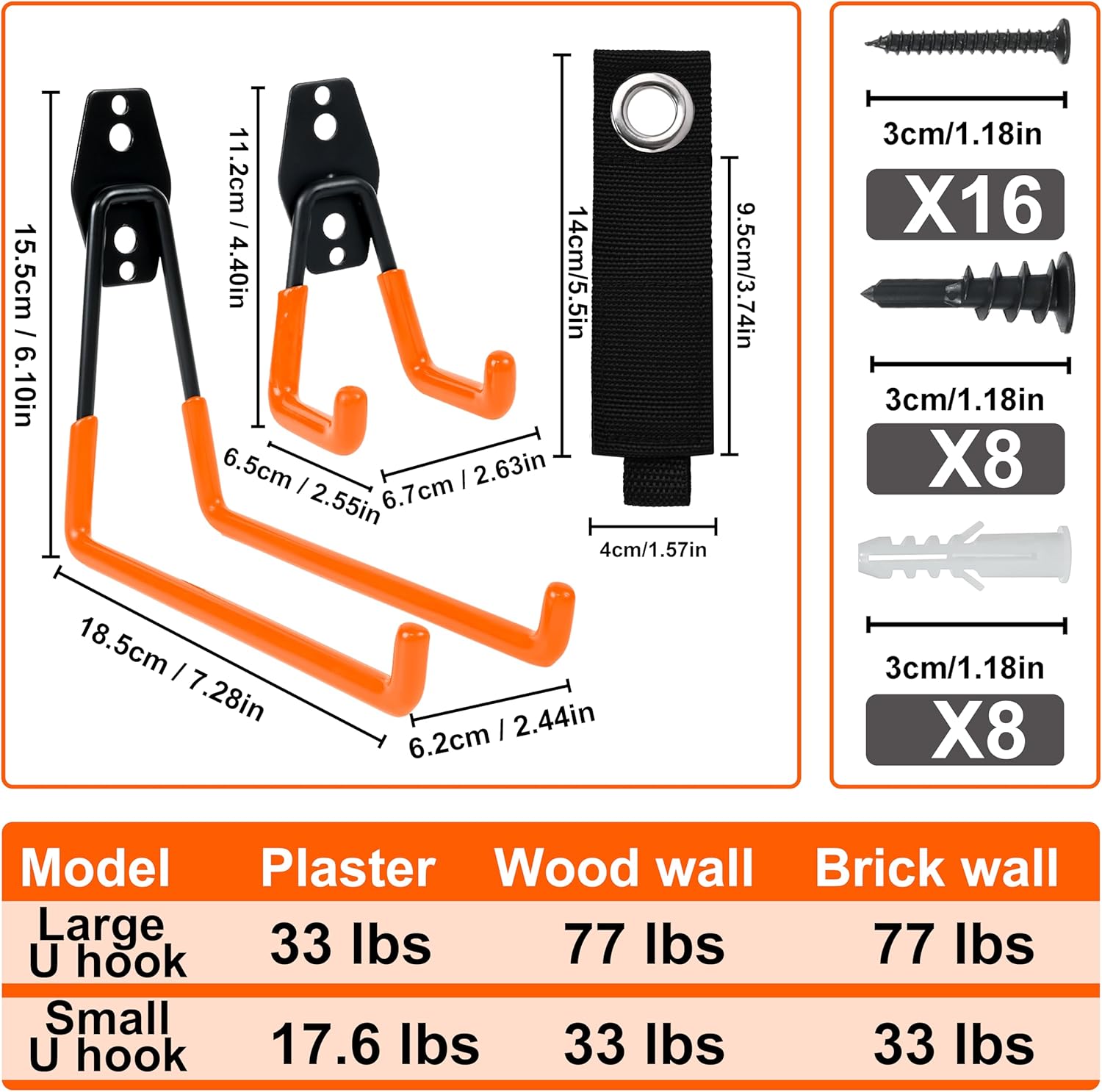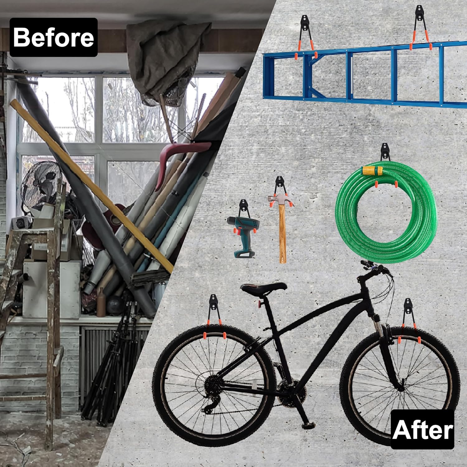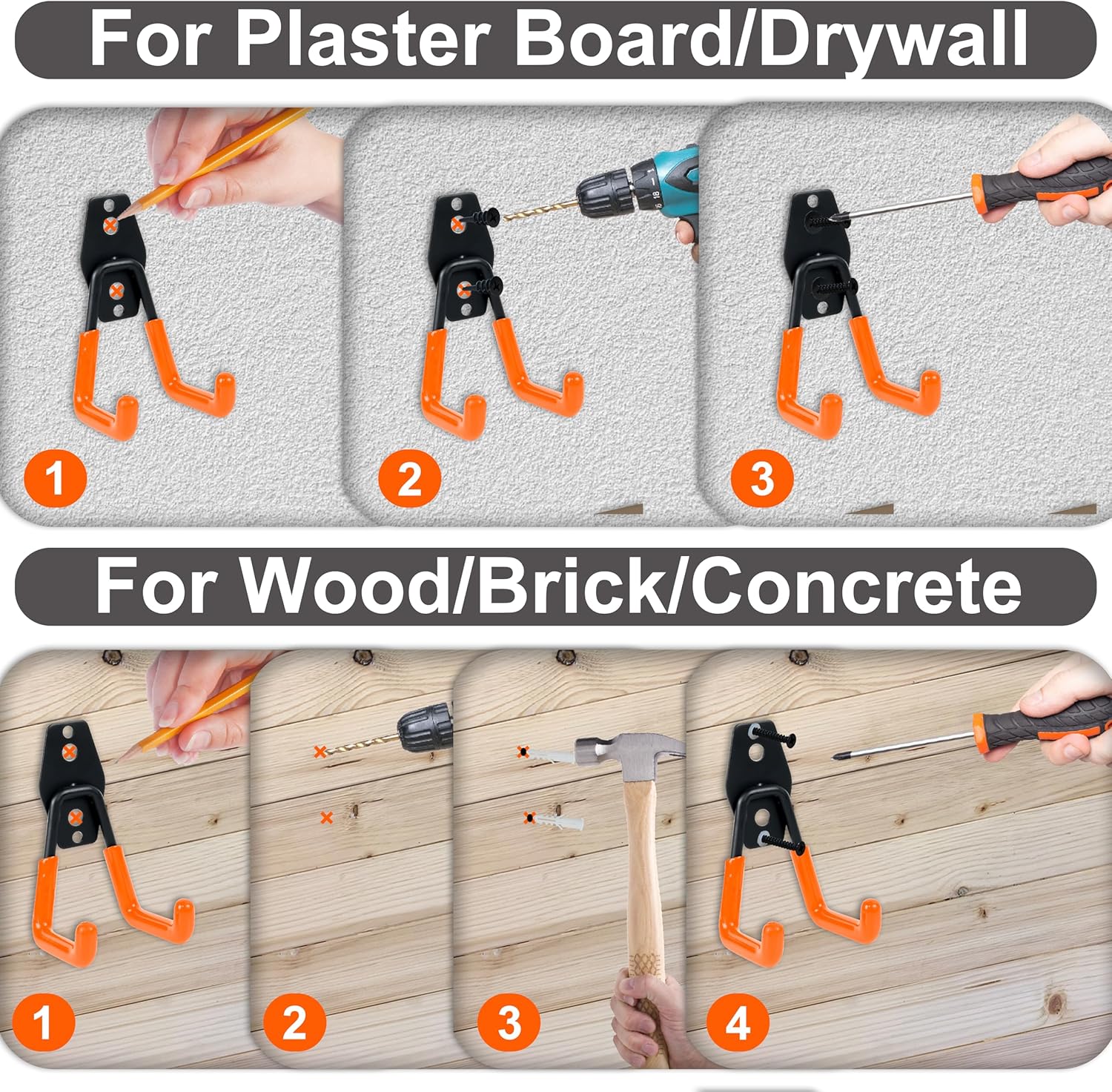 - VERSATILE STORAGE SOLUTION - These wall-mounted hooks optimize garage, basement, or shed storage, neatly holding ladders, bikes, hoses, power tools, and more. Say goodbye to clutter and create an organized, efficient workspace