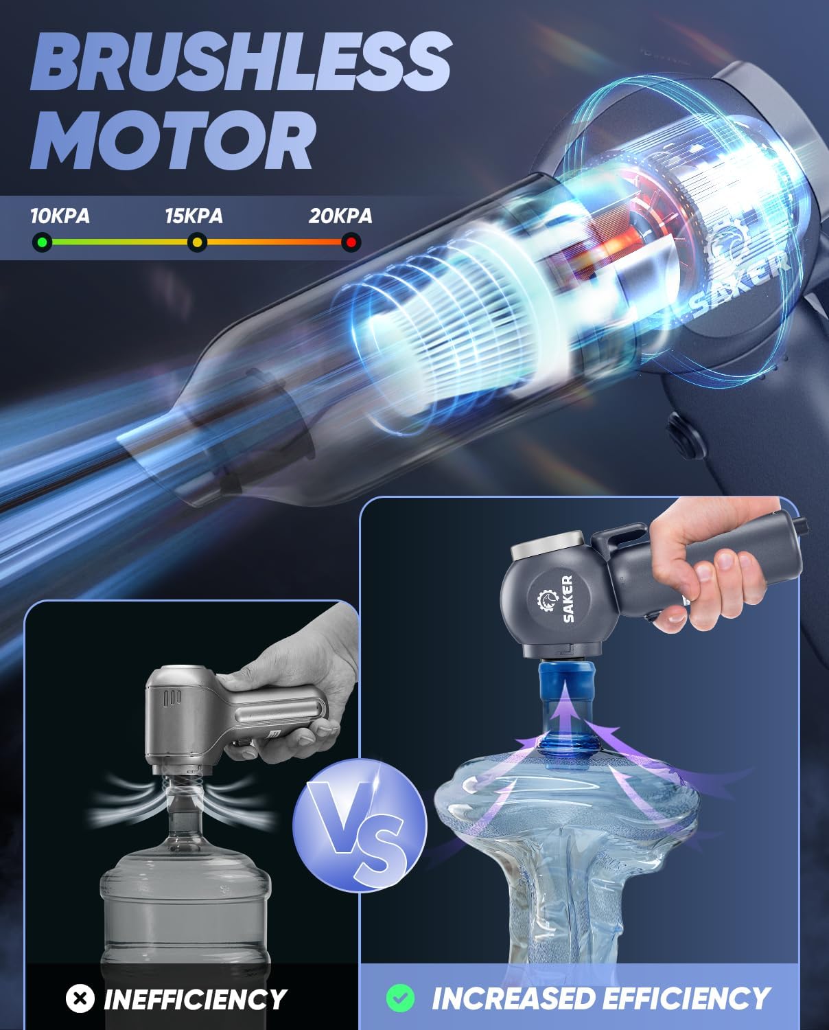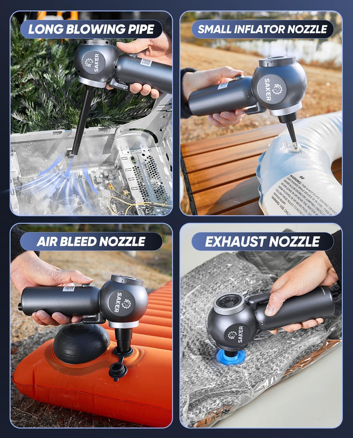 - 【6-in-1 Multifunctional Vacuum Cleaner】The Saker handheld vacuum cleaner is equipped with various nozzles, which can be used to blow away dust, suck up garbage and hair, and inflate lifebuoys or air cushions. It integrates three functions: blowing, vacuuming, and inflating. At the same time, car vacuum cleaner can also be used for emergency rescue inside the car, such as breaking windows at the bottom and cutting seat belts on the side. The USB charging port output at the bottom can also make it a convenient portable power bank to meet your multiple needs.