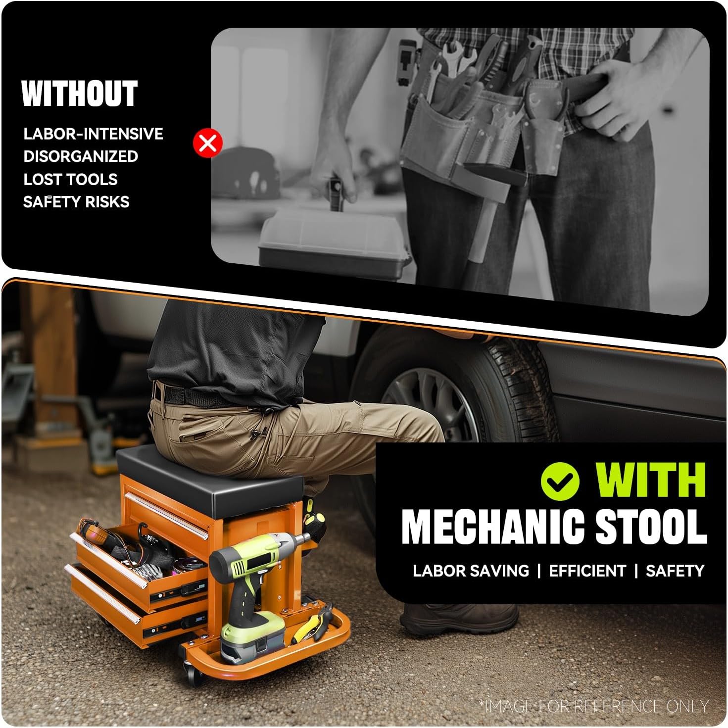 - Convenient Storage: This rolling seat has 3 drawers and 2 fold-down side trays, which offer ample storage for small tools and parts. Keep your car care and repair essentials close at hand, allowing you to work more efficiently.