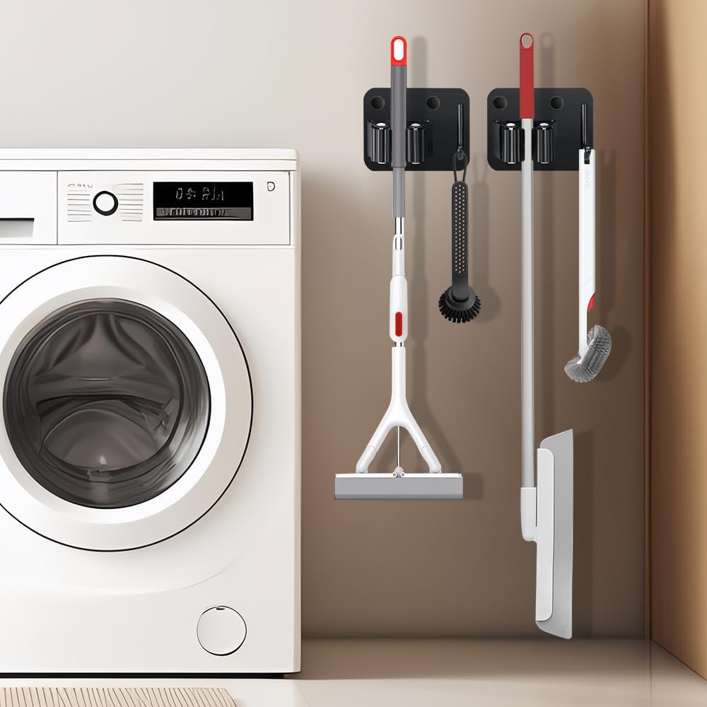 2-Pack Broom Holder with Heavy Duty Hooks, Upgraded Stainless Steel Mop Hanger. Wall Mount Utility Tool Rack for Kitchen Garden Laundry Garage. Matte Black.