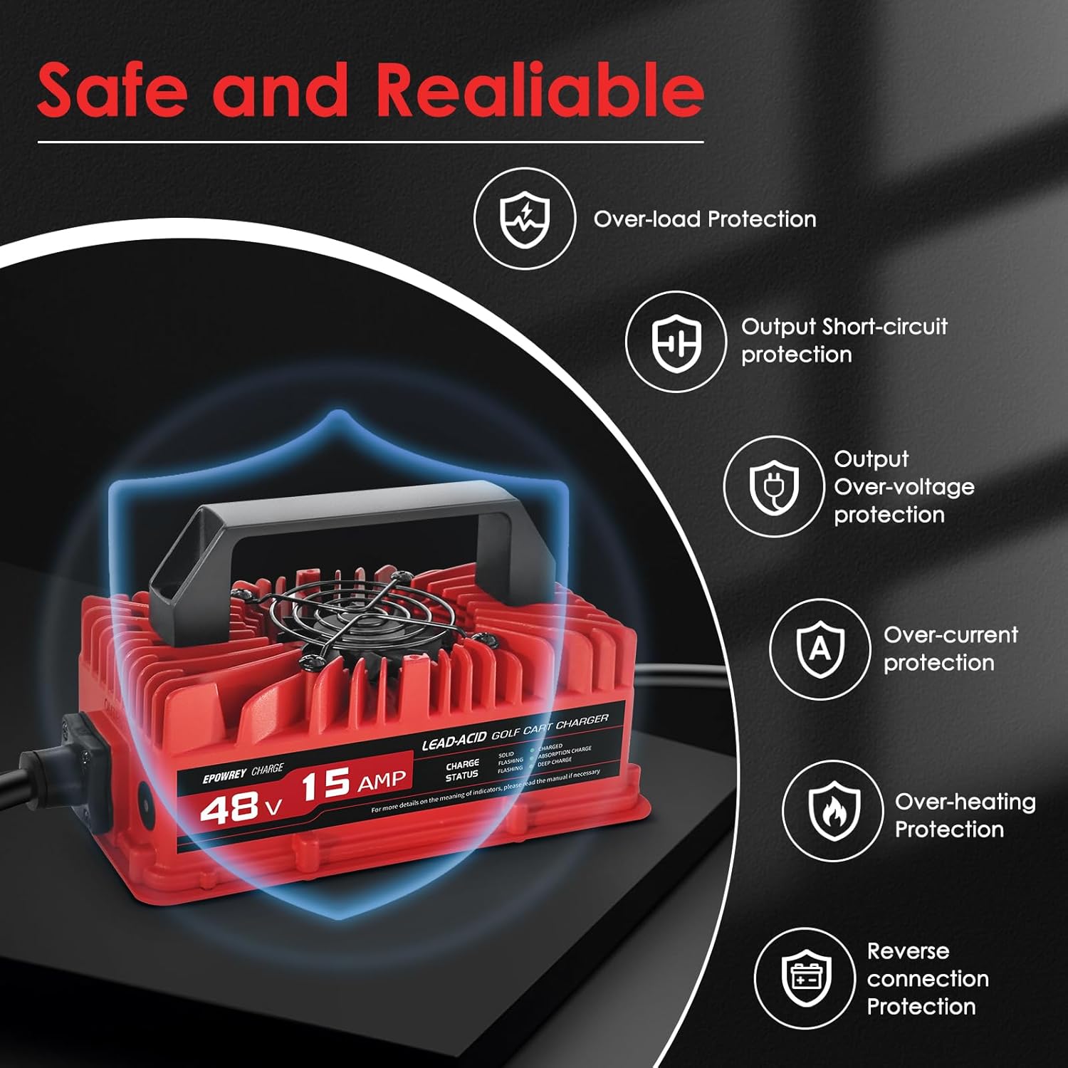 - 【48 Volt 15 Amp Golf Cart Charger】EPOWREY golf cart battery charger is designed to quickly and safely charge EZGO RXV and TXT golf cart batteries with 3-pin Triangular plug. Our golf cart battery charger utilize advanced smart charging technology with high output voltage and current accuracy, good stability and up to 90% efficiency to ensure efficient and reliable power for your golf cart