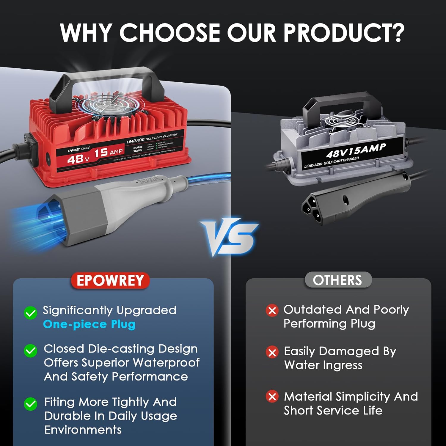 - 【Upgraded One-piece Plug】This golf cart charger adopts a new one-piece plug, solid design to reduce the misalignment of copper cores inside the plug, and better performance in insulation and heat conduction to provide a better charging experience