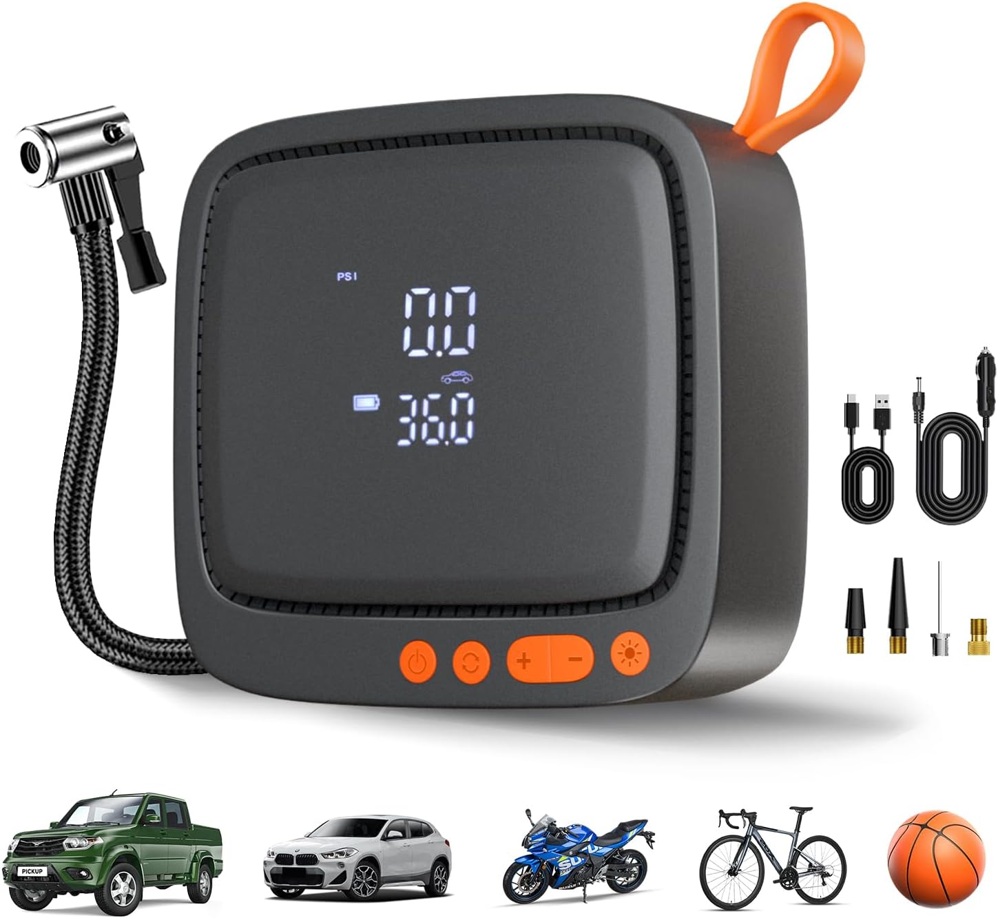 - BUILT-TO-LAST, EASY TO USE & STORE: This tire inflator for car is built-to-last, and stable on the surface while inflating, easy to use with intuitive interface. The air hose is specifically designed to be stored at the bottom of the tire inflator tool to save storage space and the tool itself can be easily fitted into glove box, trunk. This 12v tire inflator is great tool pick for car owners, mobile technicians, garages, and perfect gift idea choice for your loved ones.