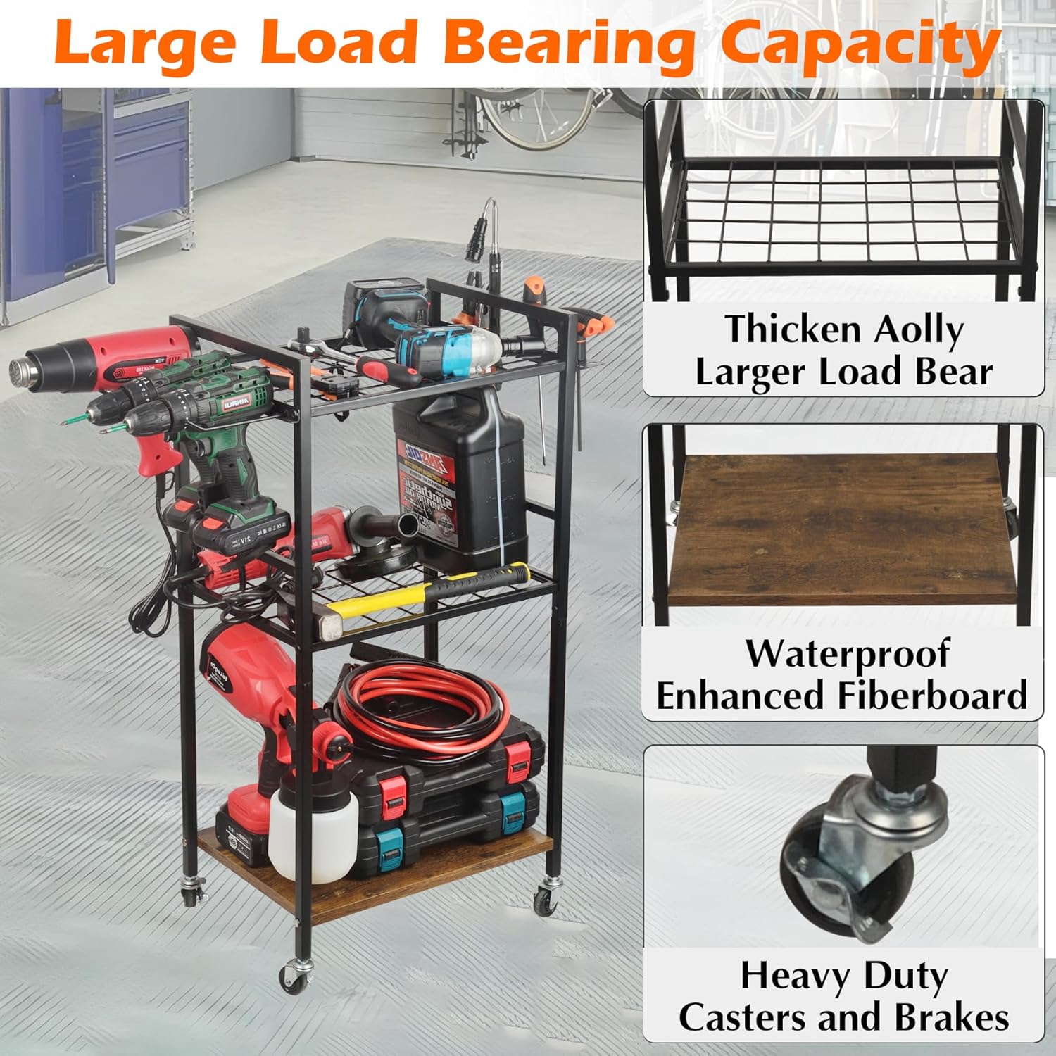 MUTUACTOR Heavy Duty Garage Tools Organizer Cart,3-Tier Rolling Utility Tool Chest with Electric Impacts Rack,Large Load-Bearing Shelf Storage Metal Rack Tool Cart with Wheel for Organizer and Storage