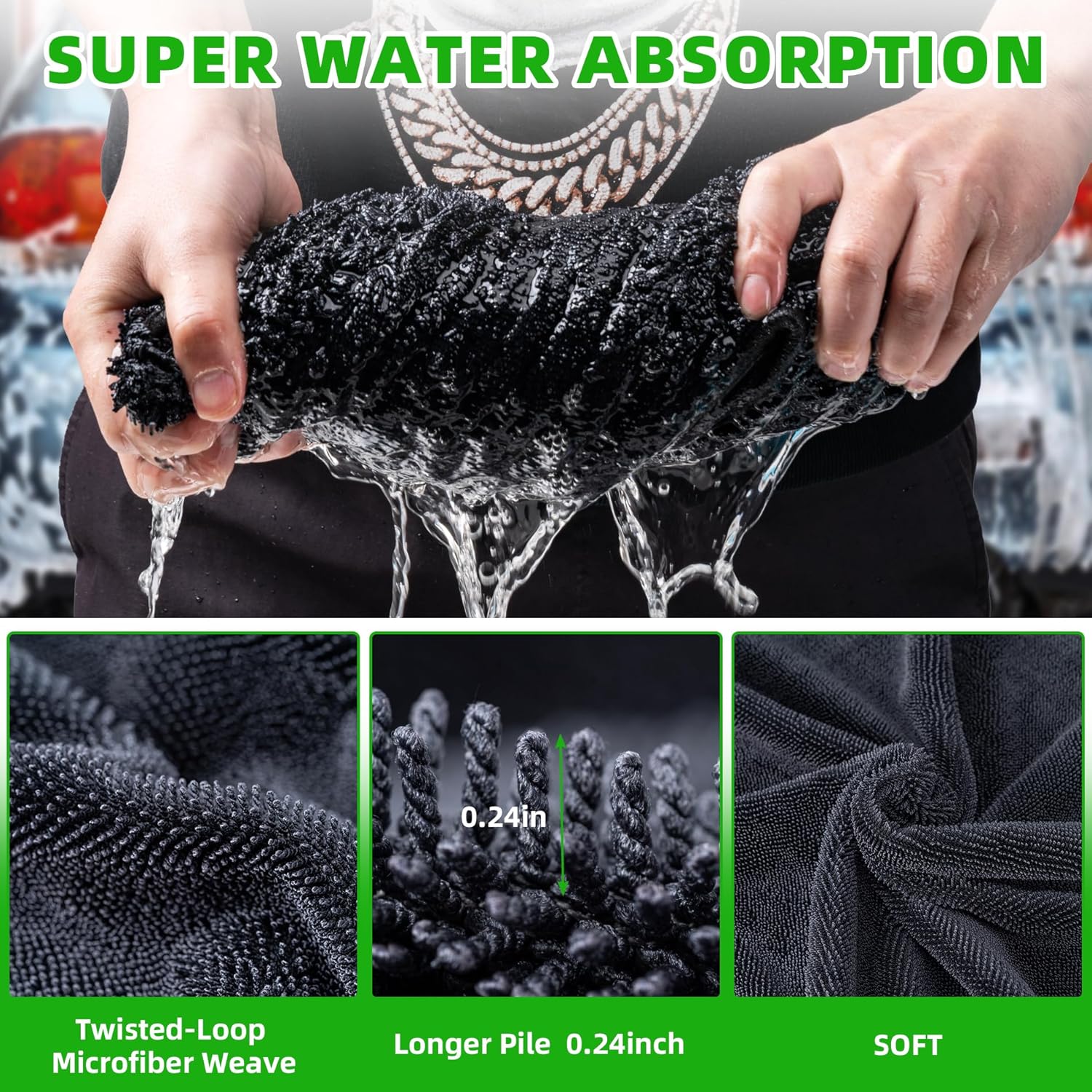- Super Absorbent: Utilizing advanced twisting yarn microfiber technology which work to trap missed dirt and debris deep within its fibers and greatly increase the contact area with water, absorbing tons of water off the surface of any vehicle for a spot-free shine after a wash.