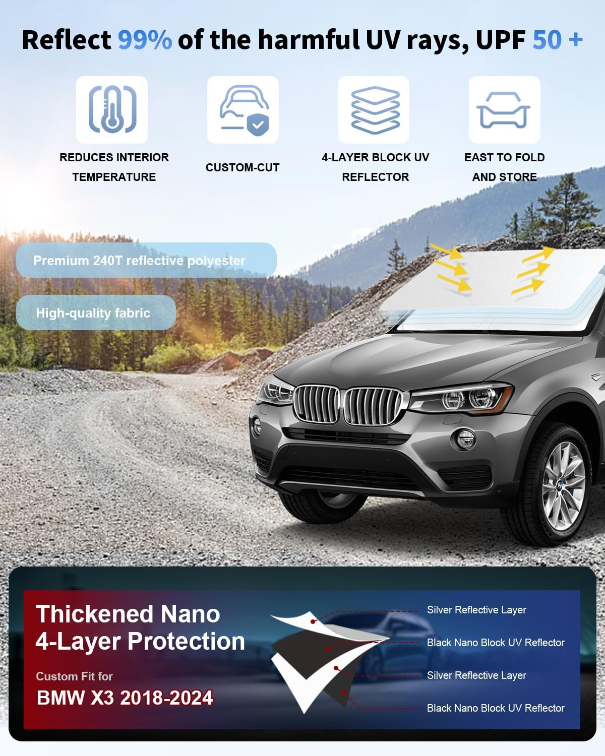 Windshield Sun Shade Sunshade for 2018-2024 BMW X3 Windshield Cover for 2023 2025 BMW X3 Base, xDrive28i, xDrive35i, M Sport SUV Accessories Foldable Sun Visor Protector Front Window UV Rays Blocker