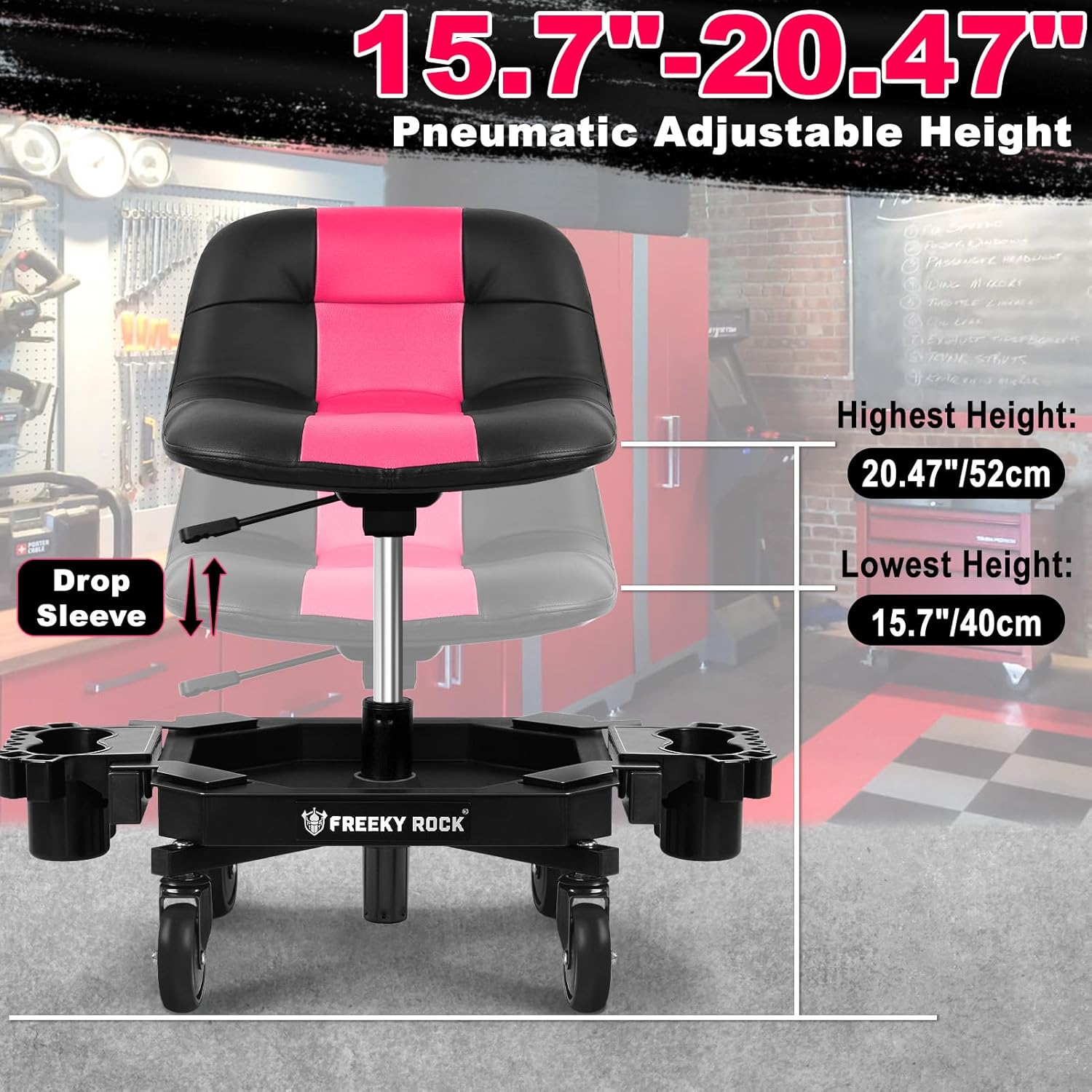 Rolling Stool with Wheels, Adjustable Height Pneumatic Garage Work Mechanic Stool Seat with Backrest, 400 LBS Capacity 360° Swivel Mechanic Crepper Chair with Tool Tray Storage, Pink