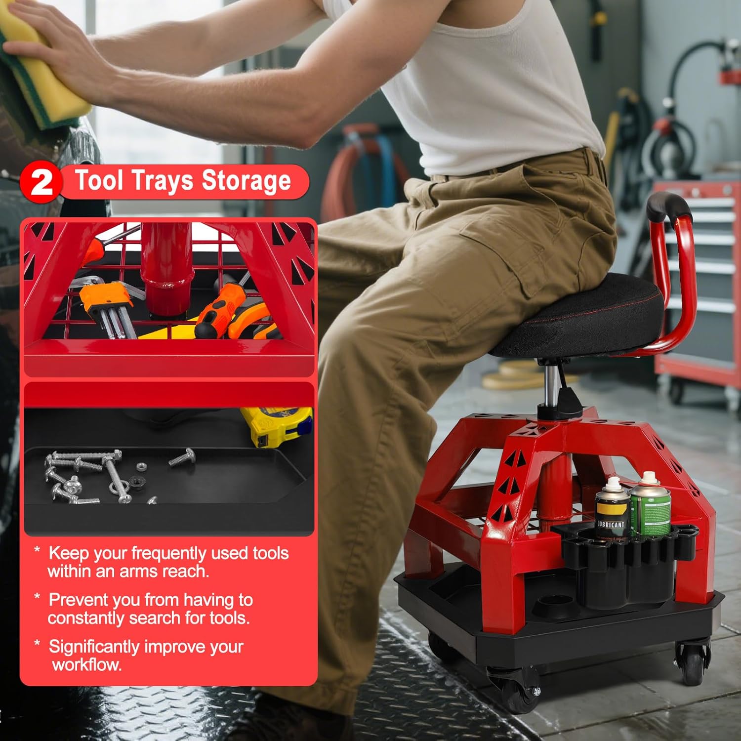 Rolling Shop Stool with Wheels, Heavy Duty Garage Work Mechanic Stool with Backrest, Adjustable Height 360°Swivel Rolling Chair with Tool Tray Storage, 330 LBS Capacity, Red