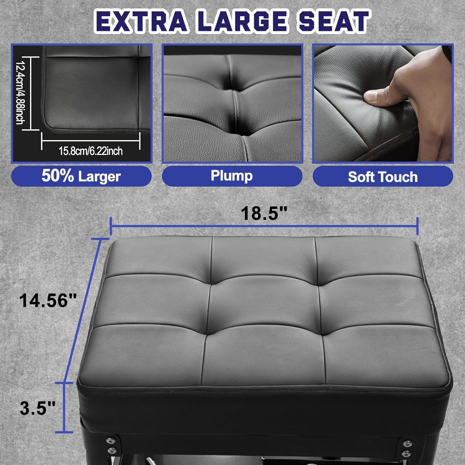- Extra Large Seat Cushion: This rolling shop stool is equipped with an extra-large seat cushion that measures 18.5 inches in length, 14.56 inches in width, and 3.5 inches in thickness.The roller seat cusionis 55% larger than the other chairs.