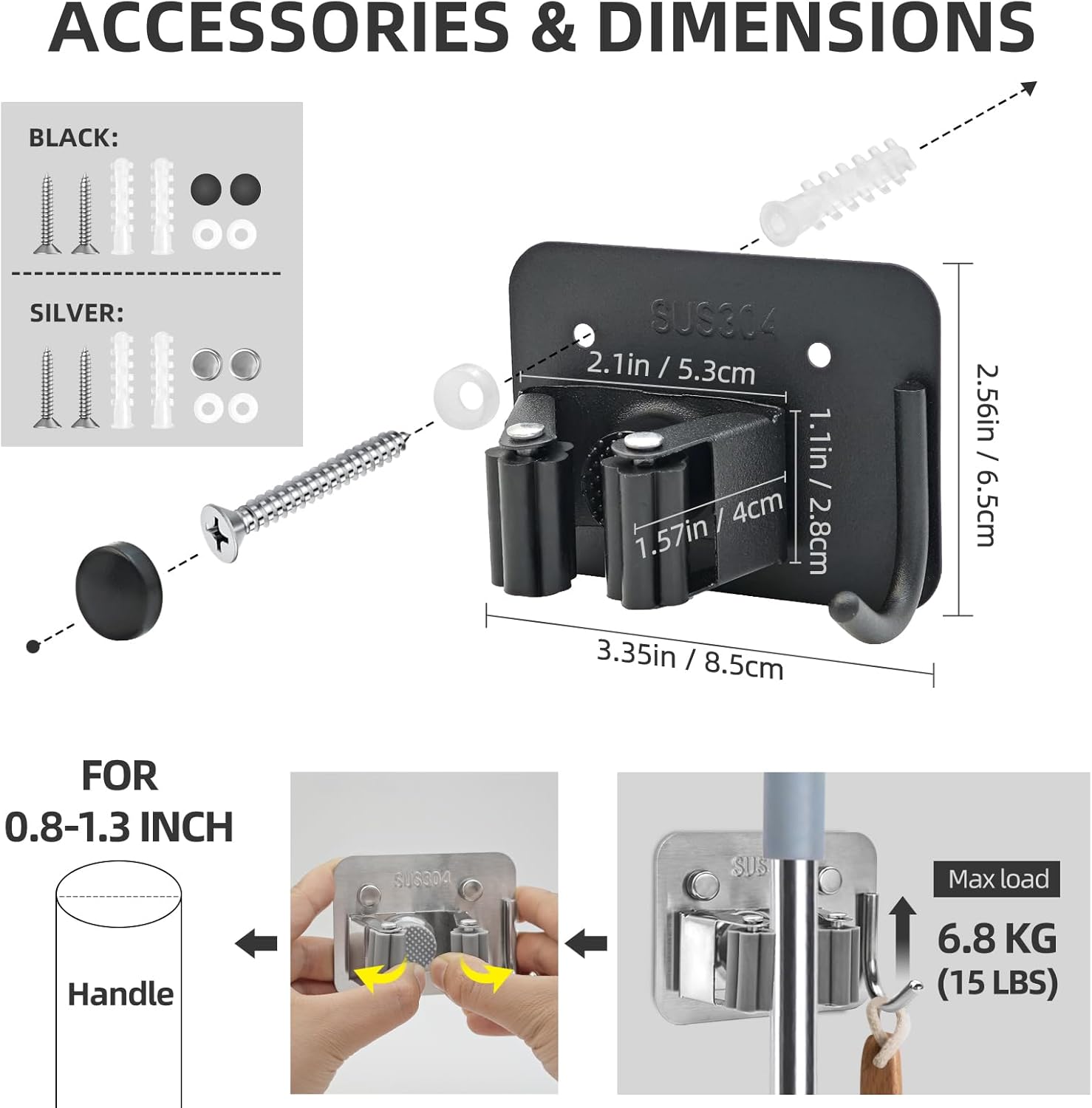 - đ§šăUtility & AestheticăCrafted from premium 304 stainless steel, this broom rack is durable and also rust-resistant. Our wall-mounted broom hooks can support an impressive weight of up to 15 pounds. In addition, each bracket is equipped with two screw decorative caps of the same color to ensure aesthetics. The sleek silver brushed and black frosted process designed to blend seamlessly into your space.