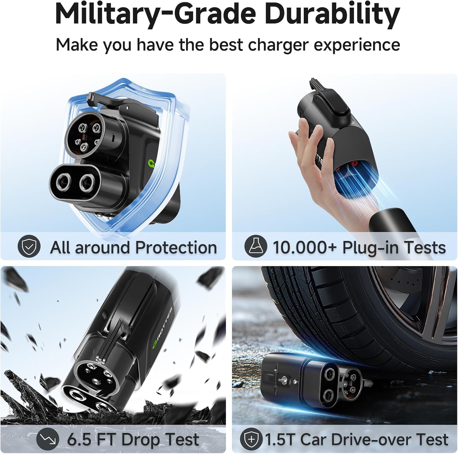 - 【Durable & Reliable】 Crafted from premium pure copper with silver-plated conductors and a fiberglass-reinforced PC shell meeting UL94 V0 standards. Featuring an IP54 waterproof rating, high flame resistance, and tested for 6.5 ft drop resistance, 1.5-ton vehicle pressure, 20,000+ mating test, and 4,700 lbs load capacity for lasting durability and reliability.