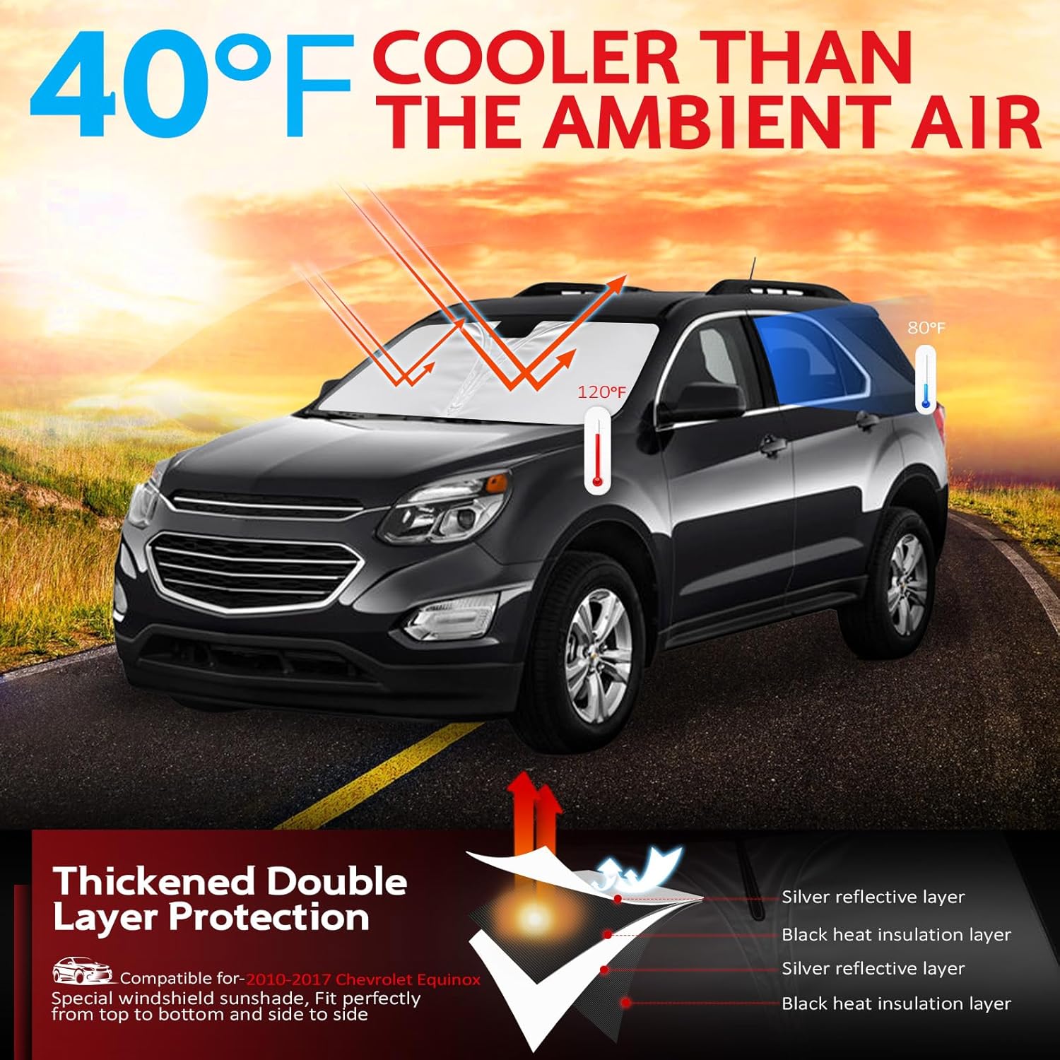 - KAYZT windshield sun shade is precise custom fit for 2010 2011 2012 2013 2014 2015 2016 2017 Che-vrolet Equinox, Thoroughly covers every corner of the windshield, Tailored to accommodate rear view mirror, Ensuring a seamless and snug fit without obstruction, Must have car accessories for Chevy Equinox