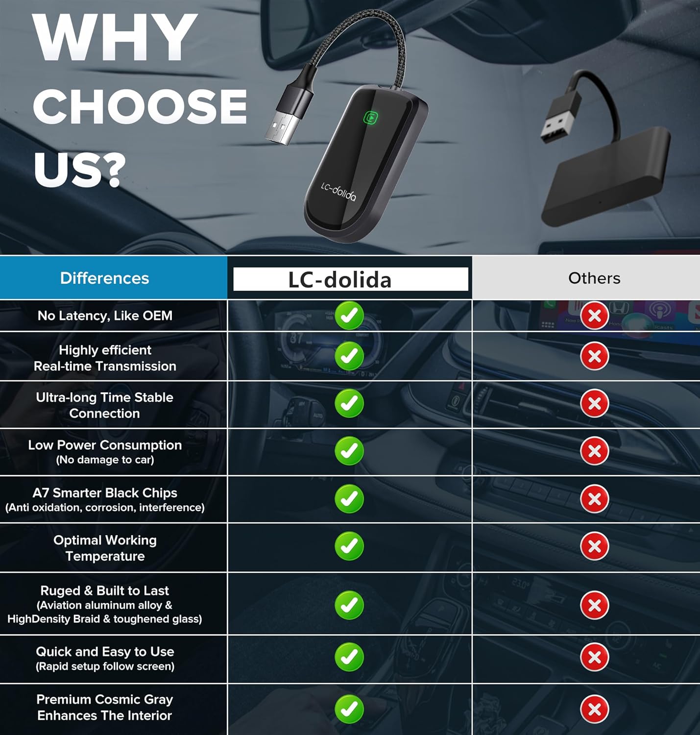 - Durable Build with Premium Materials:Crafted with a robust aluminum alloy shell and reinforced nylon braided cable, our CarPlay adapter is built to withstand daily wear and tear. The UV-cured welding process enhances durability, ensuring long-lasting performance even in challenging conditions like extreme temperatures or frequent plugging and unplugging.