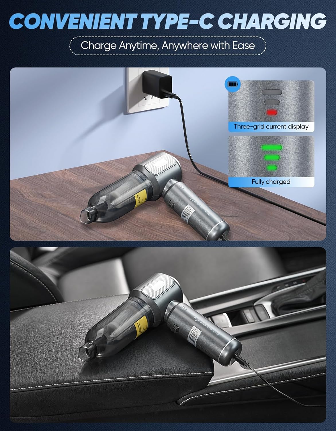 - 【3-in-1 Functionality for Every Task】The mini vacuum isn't just for vacuuming! With multiple attachments, the small vacuum lets you vacuum dust, blow away debris, inflate air mattresses, and even deflate them effortlessly. Use the dust-blowing function to clear keyboards, car vents, and tight spaces. Planning a road trip? The air inflation function quickly pumps up air mattresses, floats, or inflatable pillows. And when it's time to pack up, the air deflation mode saves space by removing excess air. This multi-functional powerhouse is your perfect companion for car cleaning, home maintenance, and outdoor adventures.