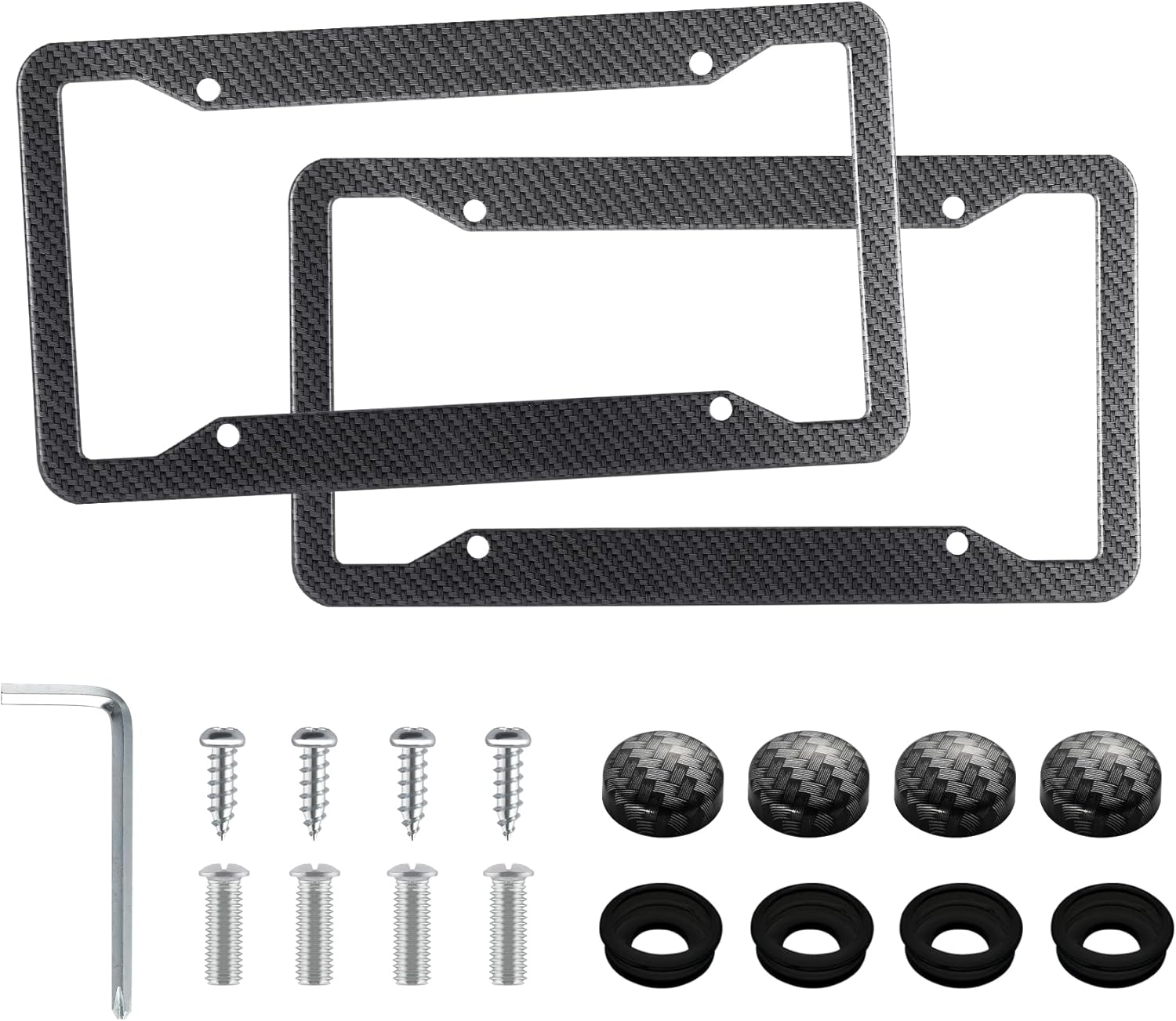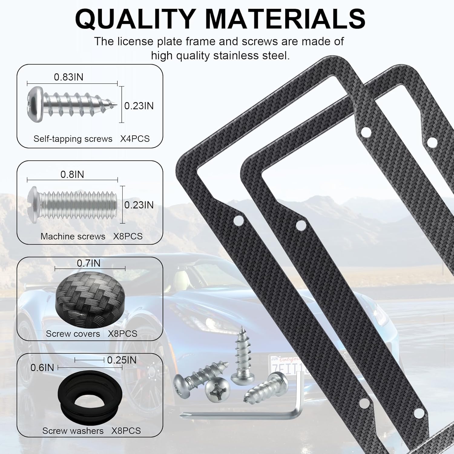 LivTee Carbon Fiber License Plate Frames, 2PCS Car License Plate Holder, 4 Holes Stainless Steel License Plate Covers, Automotive Exterior Accessories, Slim Design with Gasket Cover for US Cars