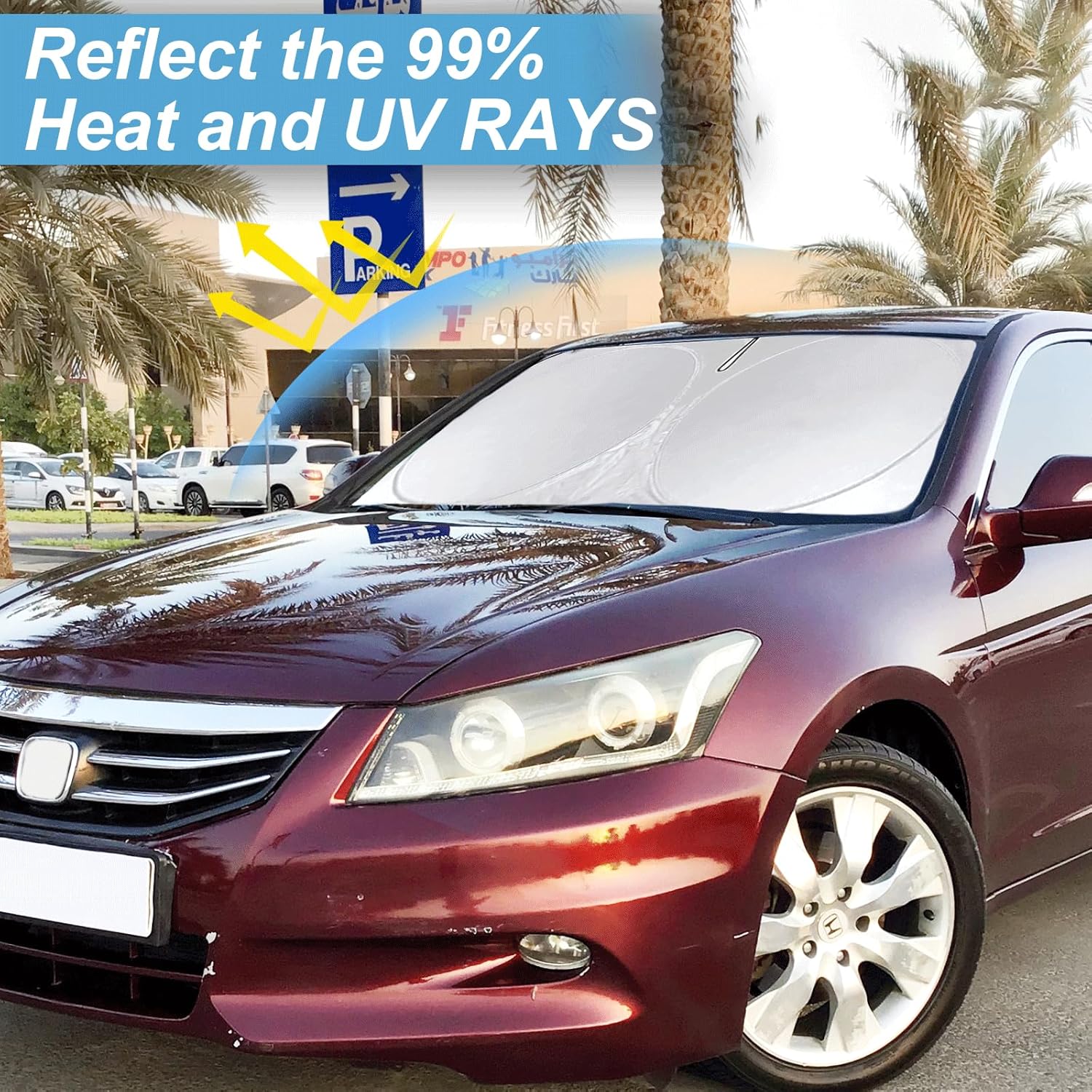 - [99% UV PROTECTION]-Extreme heat from UV rays over a period of time, can cause harm to your vehicles interior, leather seats, dashboard and electronics. Windshield sun shade made of 210T polyethylene microfiber, reflect 99% of ultraviolet rays-for maximum protection for your vehicle's interior, keeping your seats and steering wheel cool by blocking the sun's heat and harmful UV radiation rays, keep your cars interior cool and comfy, preventing fading and cracking of your dashboard.