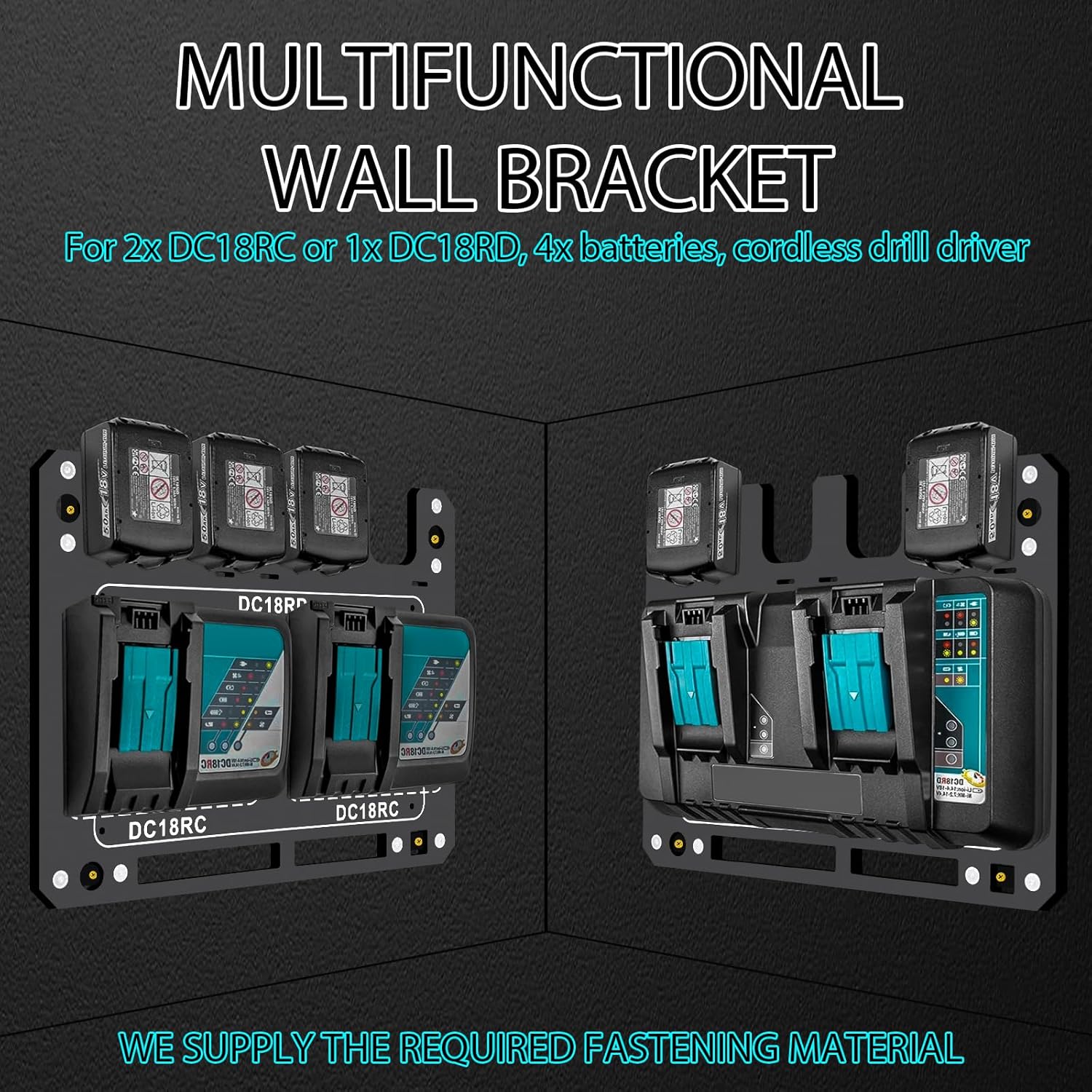- Flexible design: suitable for Makita's battery wall mounting brackets. All mounting holes are pre-drilled for two different chargers for Makita, including two DC18RC single chargers for Makita or one DC18RD dual charger for Makita. Removing additional components and adding heat dissipation allows the charger to operate more efficiently and safely