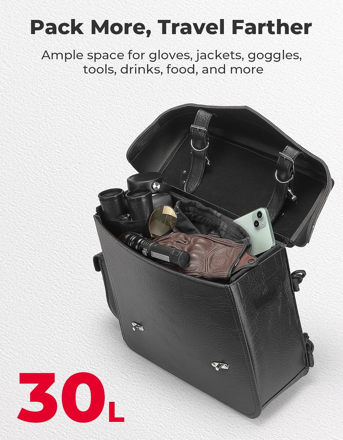 - 30L Large Capacity: The motorcycle saddle bag offers ample storage for all your essentials, including cups, drinks, gloves, jackets, wallets, headphones, power banks, raincoats, groceries, tools, and more. Kemimoto saddle bags are convenient and easy to locate on your bike, making them ideal for daily commutes and short getaways