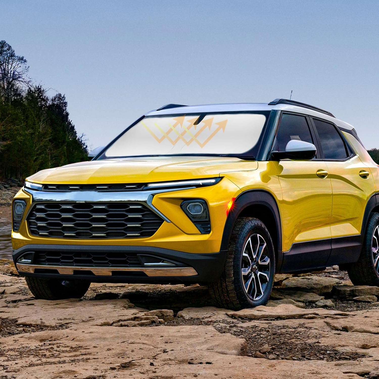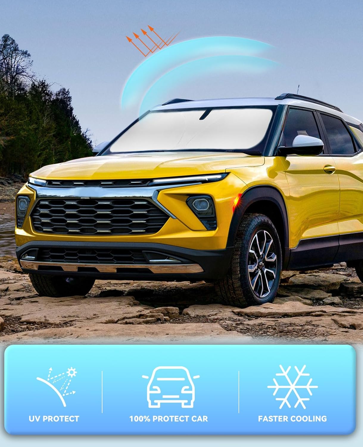 - ăVehicle SpecificăOur Windshield Shade Cover custom fit for Chevrolet Chevy Trailblazer 2021-2024 2025 2026, Base, Sport, Hybrid, A-Spec SUV Accessories,Full covered your windshield,No Gap,100% Perfect fit. The precise fit design and reinforced steel ring are sufficient to allow the sun shade to precisely fit the front window without the need for suction cups to hold it in place, effectively protecting your car from the sun's rays.