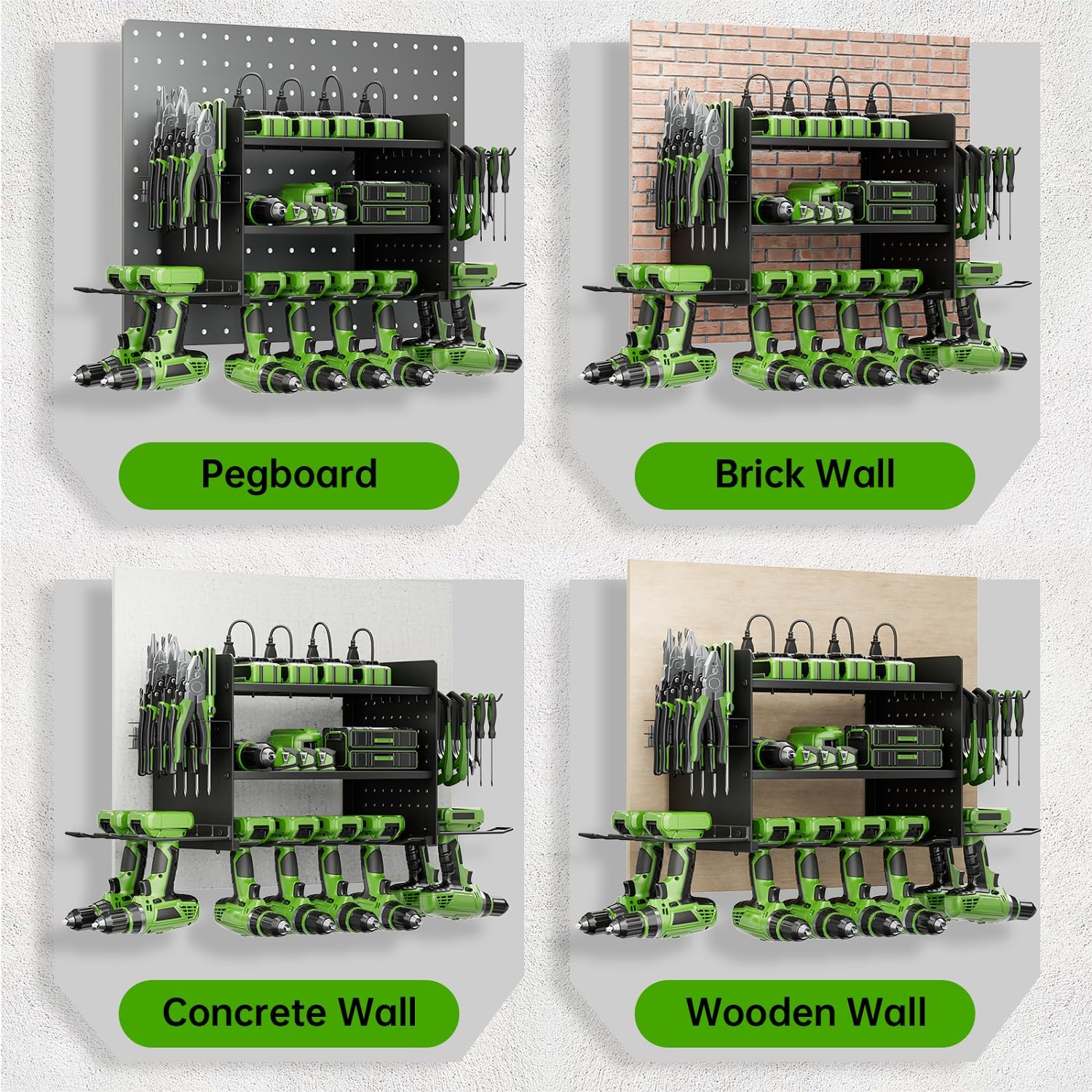 - Store 25+ Kinds of Tools: Our cordless drill holder is suitable for both indoor and outdoor use and compatible with pegboards. You can store your charging stations, batteries, toolboxes, drill bits, hammers, and other garage tools without any extra hassle.
