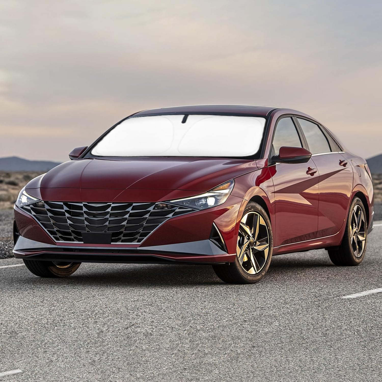 - ăVehicle SpecificăOur Windshield Shade Cover custom fit for Hyundai Elantra 2017-2019 2020 Accessories ,Full covered your windshield,No Gap,100% Perfect fit. The precise fit design and reinforced steel ring are sufficient to allow the sun shade to precisely fit the front window without the need for suction cups to hold it in place, effectively protecting your car from the sun's rays.