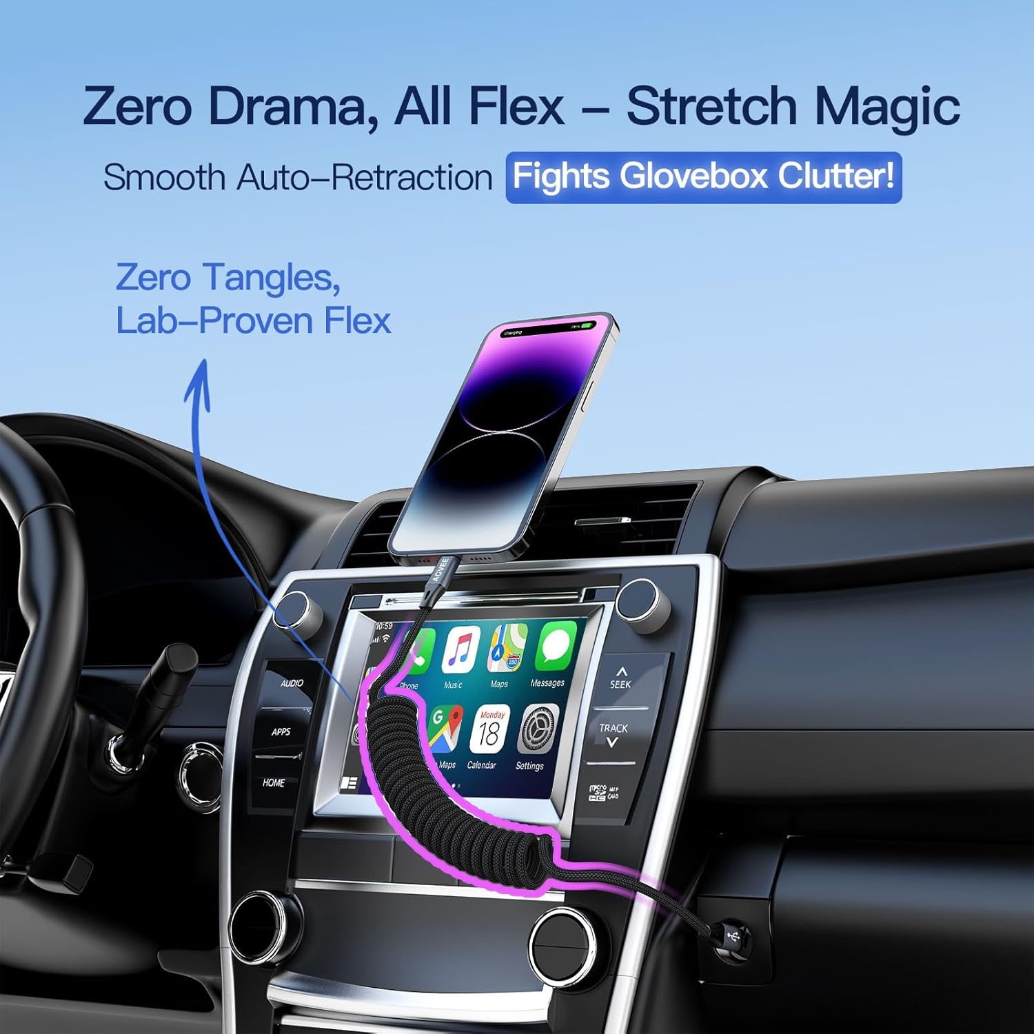 - 🚗[Tame Your Car's Cable Jungle] No more wrestling with spaghetti cords! Our coiled design stretches from short to long, perfect for tight car spaces, then snaps back neatly like a slinky. Keep your cup holders free for coffee, not tangled chaos!
