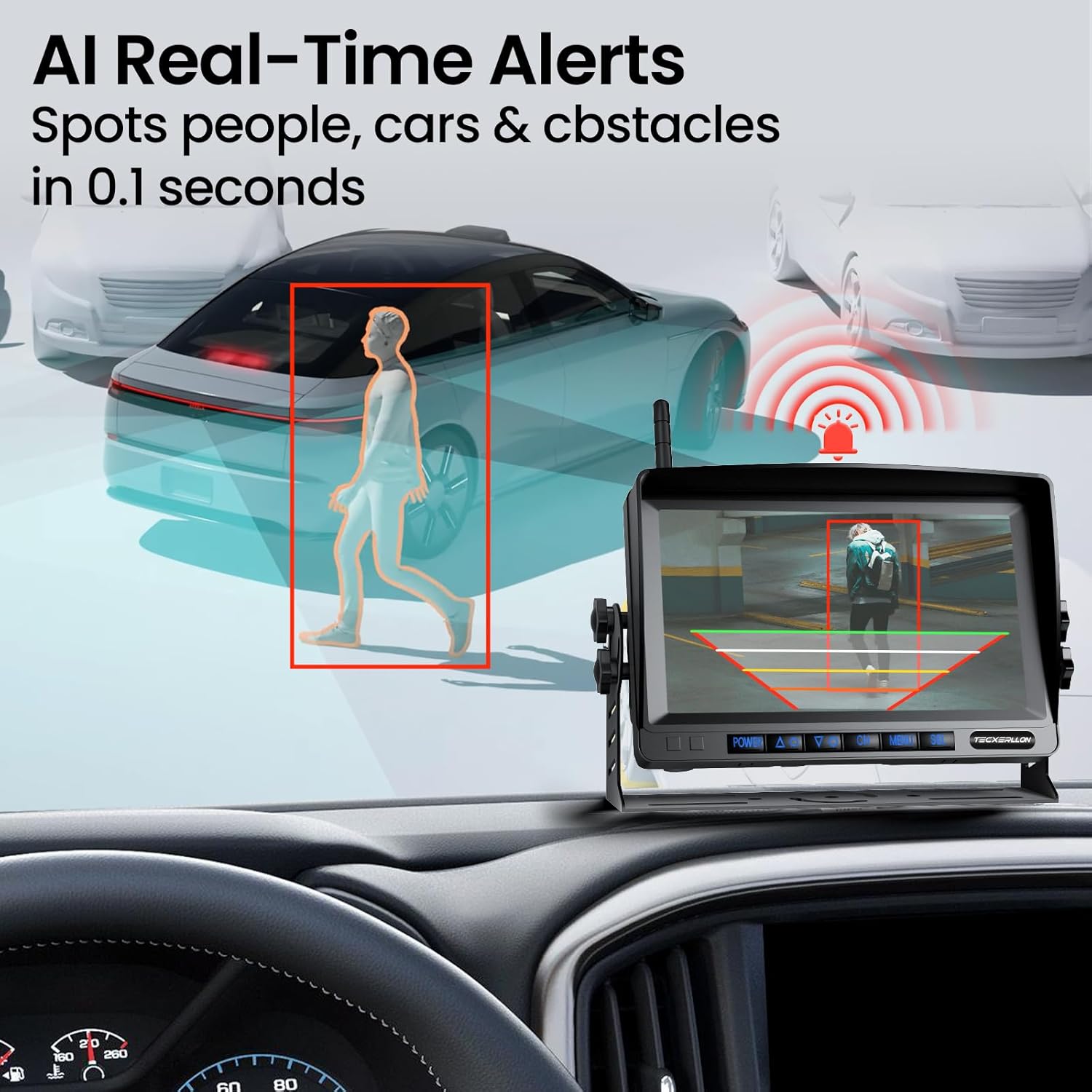 - SMART AND SAFE REVERSING WITH AI: Stay safe with our advanced AI-powered backup camera, which instantly detects pedestrians, vehicles, and obstacles. Receive real-time alerts to stay aware and in control, whether you're reversing or driving. Drive smarter, safer, and with confidenceâevery time.