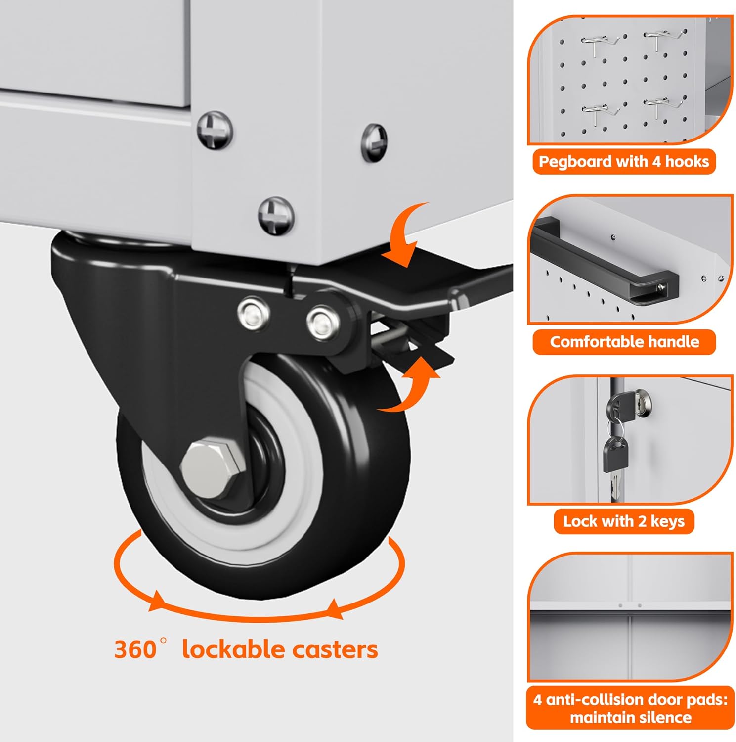 Garage Storage Cabinet with Wheels & Pegboard, 34.3" H Locking Metal Tool Storage Cabinet with Doors and Shelf & 4 Hooks for Garage, Home, Workshops, Assembly Required, White