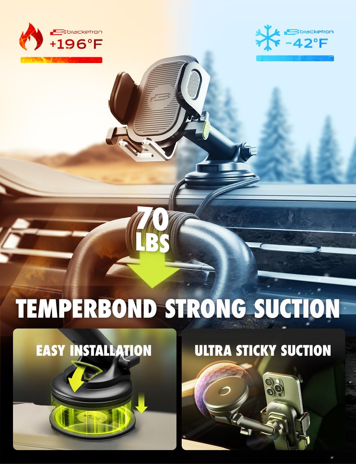 - Wide Compatibility – The universal mount is built to fit most smartphones from 4" to 7", even with bulky cases. Compatible with a wide range of devices, including those from popular brands like Apple, Samsung, Google, and more. The TemperBond suction cup features triple-layer nano adhesive and holds strong in extreme temperatures from -42°F to 196°F. It’s the perfect blend of convenience, durability, and wide-ranging compatibility.