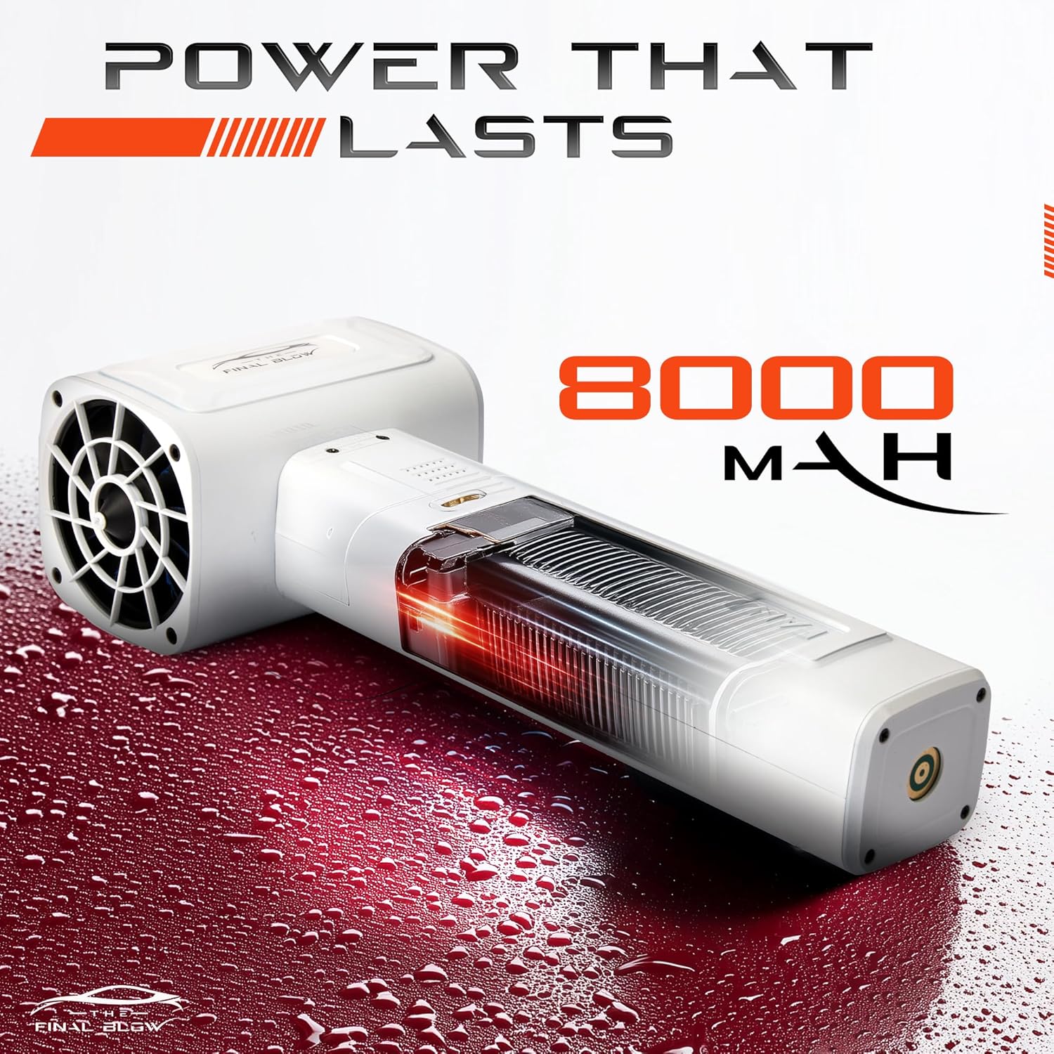 - đPOWER THAT KEEPS UP WITH YOU. Tired of car blowers that run out of juice halfway through? Our 8000mAh battery has the power for drying your entire carâwhether itâs a sports car or a full-size SUVâwithout stopping. More power, less hassle.