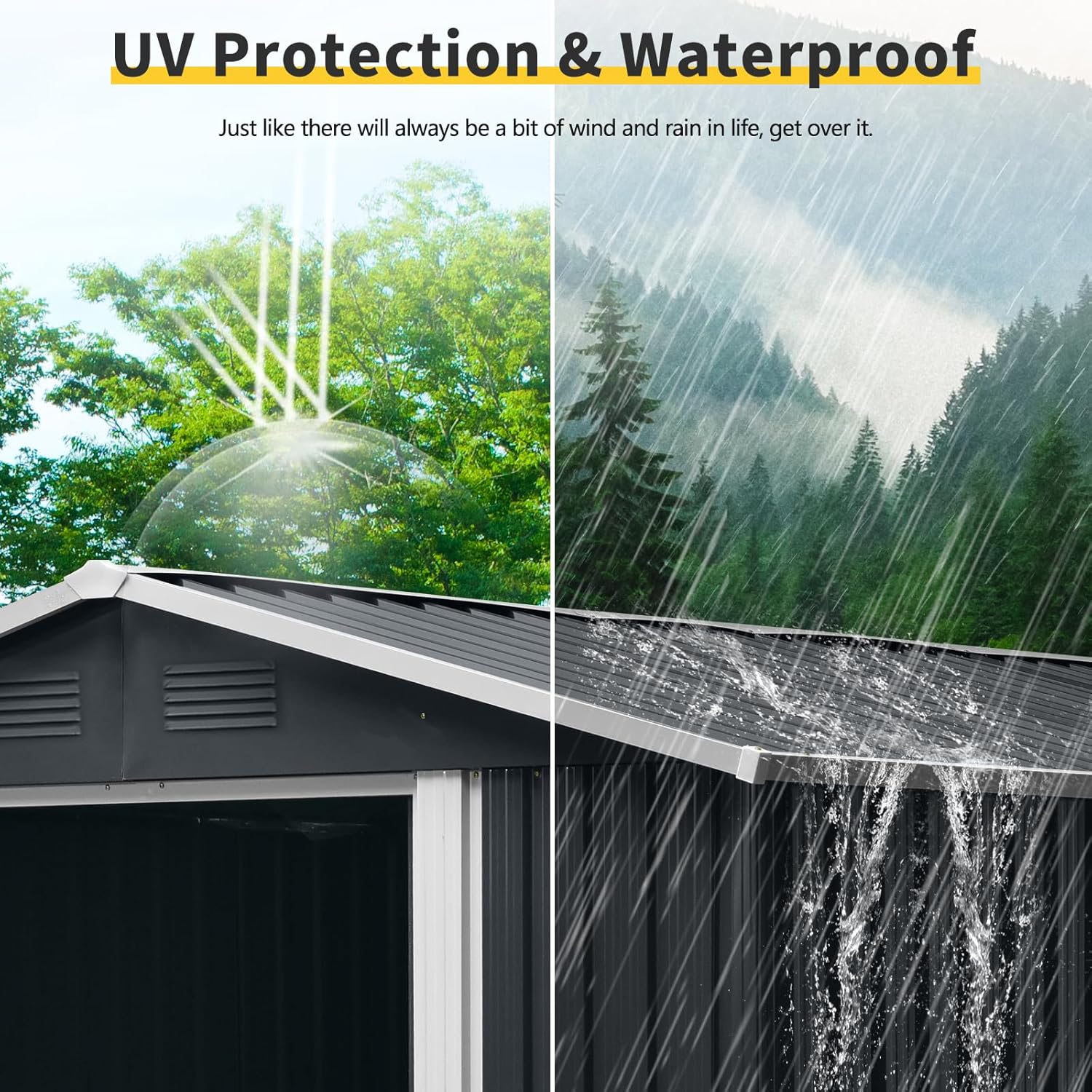 - ๐ก๐๐ฅ๐ฅ-๐ฐ๐๐๐ญ๐ก๐๐ซ ๐๐ญ๐จ๐ซ๐๐ ๐ ๐๐ก๐๐: Our metal shed 8x10 features sliding doors that open and close smoothly, with handles and a heavy-duty lock for added security. It serves not only as a safe space for storing garden tools but also as a warm pet house. The sloped roof of the storage building effectively prevents leaks and snow accumulation, while the four integrated punched vents improve airflow, helping to keep your items dry.