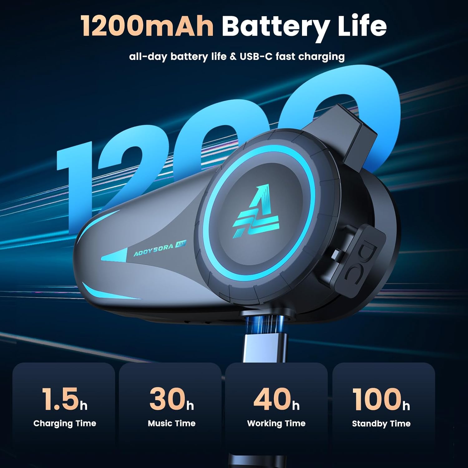 - 【Strong Battery Life & Fast Charging】AX1 motorcycle bluetooth headset is equipped with a 1200mAh large-capacity rechargeable battery. Using the Type-C charging cable, it only needs to be charged for 1.5h, and it can standby for more than 100h, talk for 40h, and enjoy music for 30h. When the headset battery is low, a "low battery" voice prompt will be issued every 5 mins, and you don't need to worry about battery life.