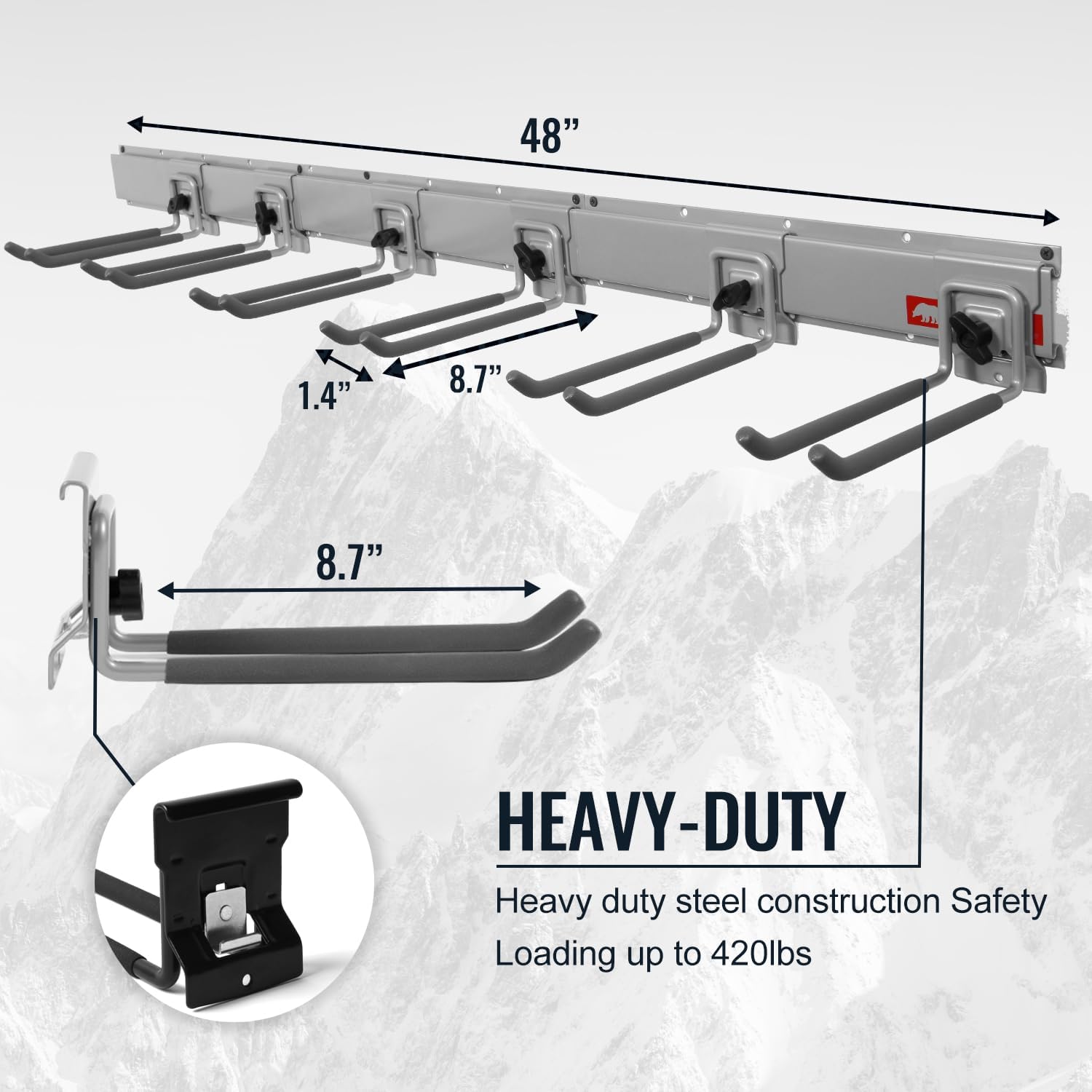 - ADJUSTABLE VERSATILE STORAGE: With a clamping screw, the hooks adjust along the wall track, accommodating various tool sizes. This garage storage system is ideal for organizing shovels, rakes, brooms, and more, making it a perfect yard tool organizer for garage.