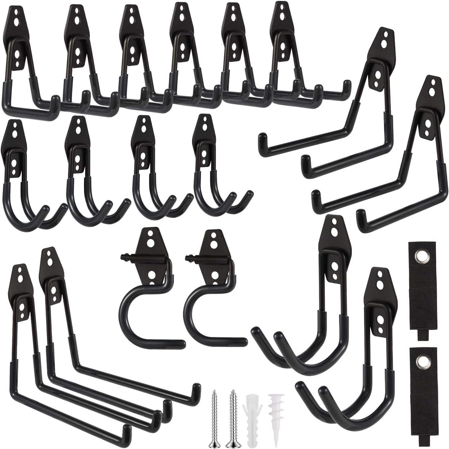 - ZexHok Wall Hook Assortment Set: 20 pack storage hooks organizer include with 6 sizes: 4pcs small J hooks, 6pcs small U hooks, 2pcs large J hooks, 2pcs middle U hooks, 2pcs large U hooks, 2pcs S hooks and 2pcs straps for hanging tools of different sizes and weight.