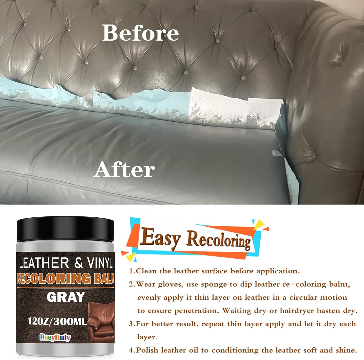 - Easy Application & Quick Drying: Gray leather recoloring balm effortlessly restore your leather and vinyl items with a simple application. Gray leather dye dries quickly, saving you time, ensuring a smooth and professional finish