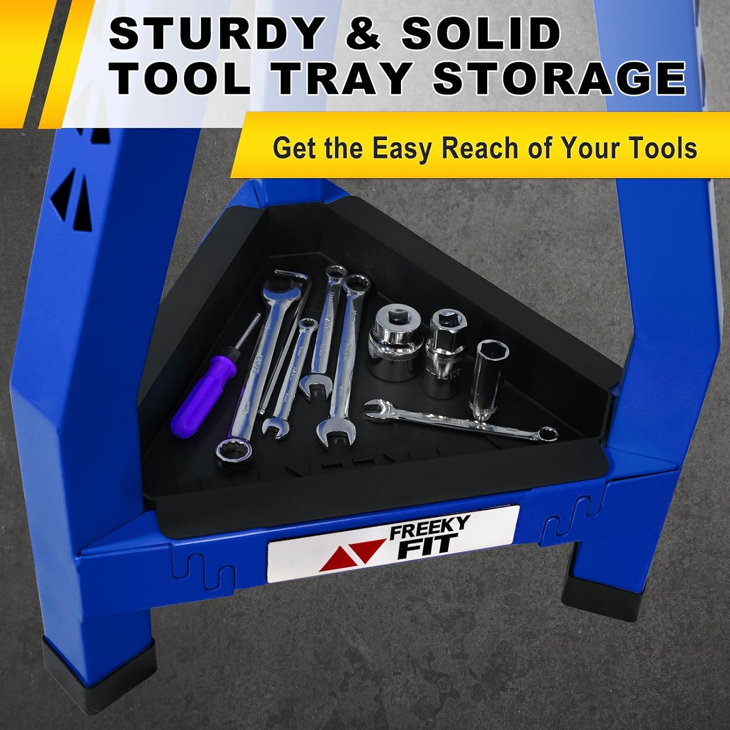 - 【Tool Tray Storage】The garage stool with steel tube and strong metal structure provides space for resting your feet. The design of this shop chair includes a triangular tool tray located under the seat. Make it convenient to store and access necessary tools and parts at anytime