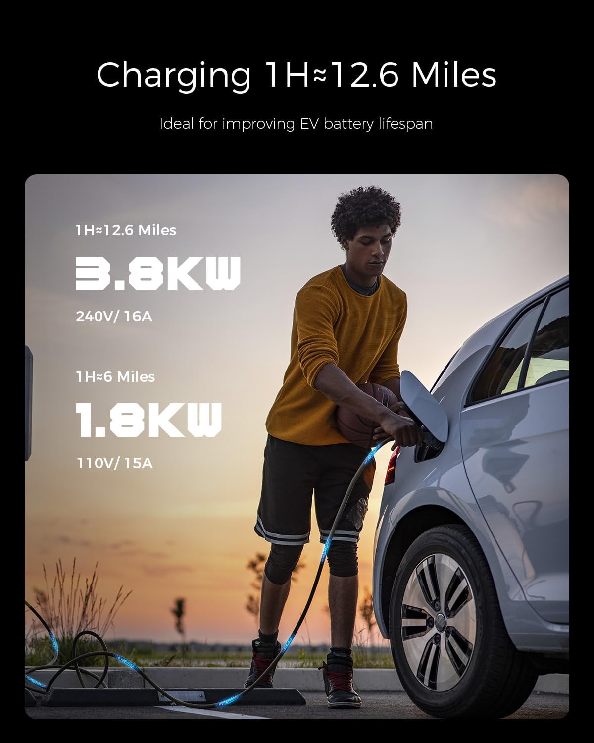 - 【16A Fast Charging】At 240V, the level 1 EV charger delivers up to 16A and 3.8kW, adding approximately 12 miles of range per hour—about four times faster than a standard 8A Level 1 charger, saving you valuable time. For 110V charging (using 5-15P or 5-20P plugs), it provides up to 15A and 1.8kW, adding about 6 miles of range per hour. The Level 1 option is perfect for maintaining your EV battery's health over time.