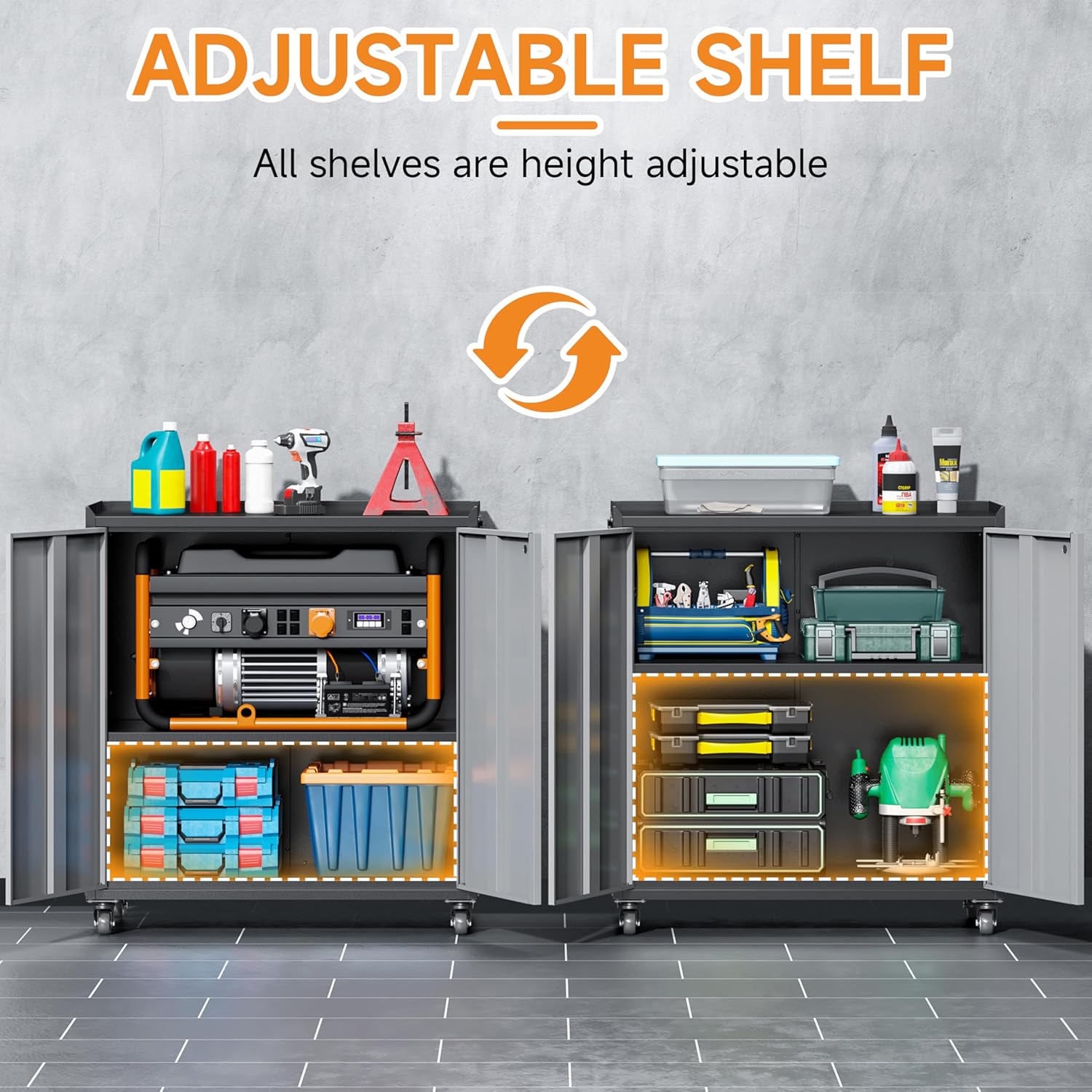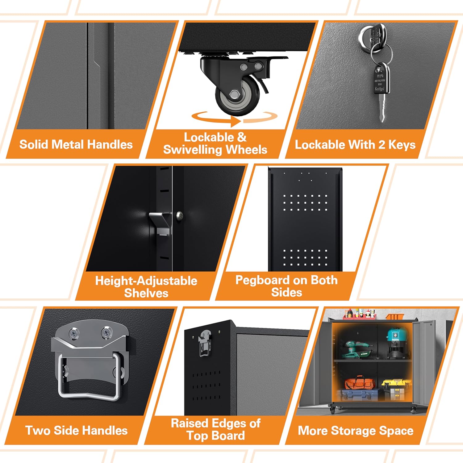 - đ§âđ§ăEffortless Mobility and Easy AssemblyăWith four 360-degree swivel casters that can be locked when not in motion, this garage cabinets with wheels is easy to move around yet stable when needed. The included assembly instructions clearly illustrate each component and step, along with an assembly video for reference, enabling one person to complete the setup in approximately 40 minutes.
