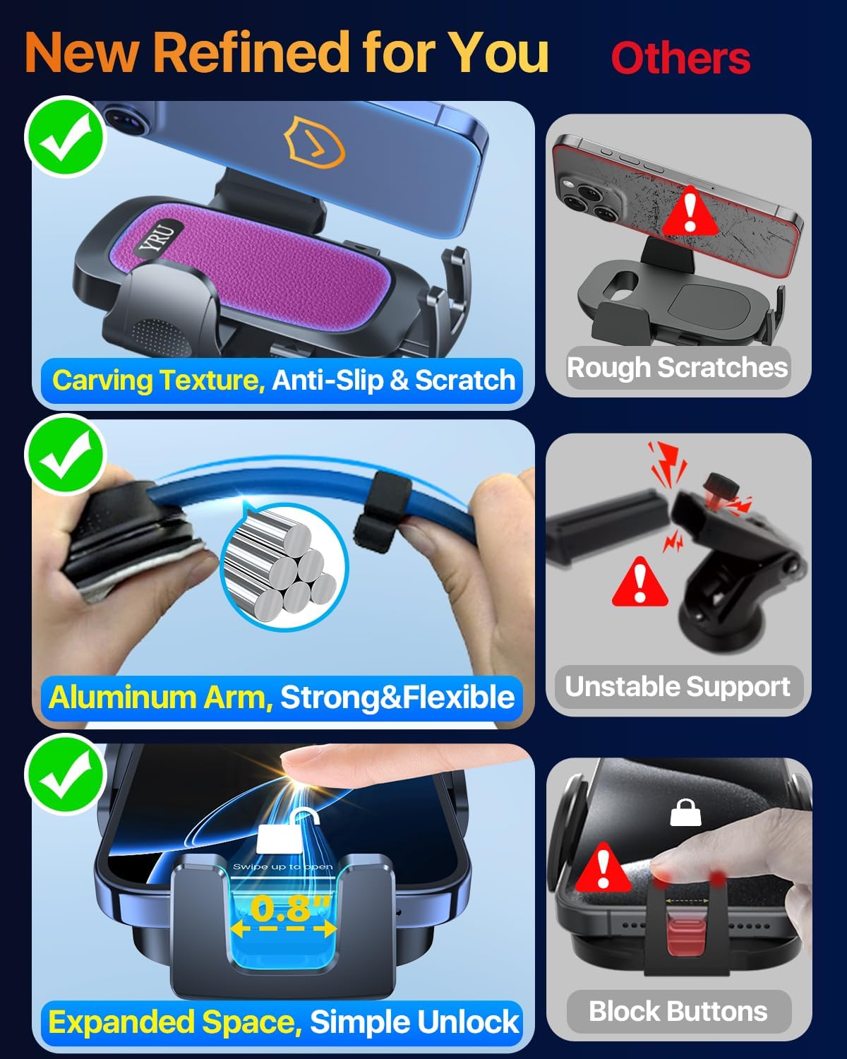 - Sleek Choice-Unique Bendable Alloy Arm, Flexible & Adjustable for Safety Concern: The Perfect Car Partner - YRU Dashboard Phone Holder with aluminum alloy arm can be bent to any angle. More flexible/convenient. Place on the dashboard/windshield or any flat surface to achieve an infinite viewing angle for safety