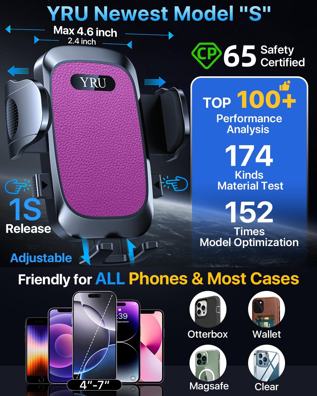 - 2025 Ultimate & High-End Car Holder, Trusted by 30,000+ Users: YRU 2025 upgraded car phone holder with 4 years of R&D passed 30,000+ users driving 900,000+ miles test, is a 3A-Grade reliable car mount, stable & durable. Got safely certified